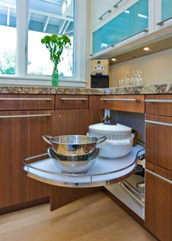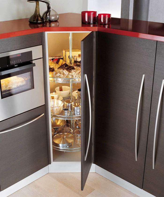 The modern market offers hostesses a variety of accessories for kitchen furniture. Given the fact that, on average, a woman spends about 2-3 hours a day behind the stove, the need for convenience becomes a priority for her. That is why manufacturers bring to the furniture market various devices for the optimal organization of space: retractable shelves, dishwashers, a “magic corner”, trays for appliances, and even a bottle holder. But the carousel for the kitchen has become one of the most popular storage options for utensils.