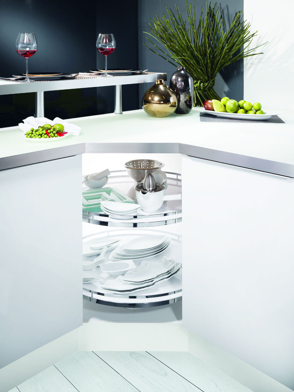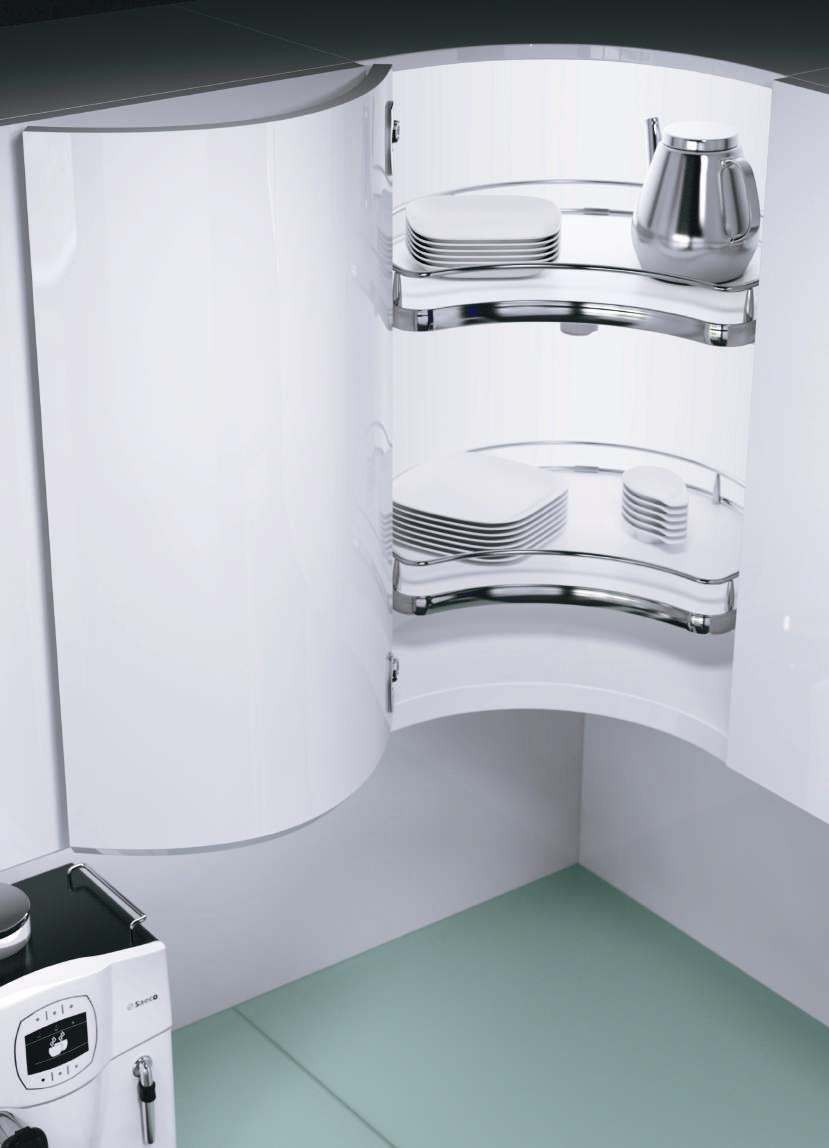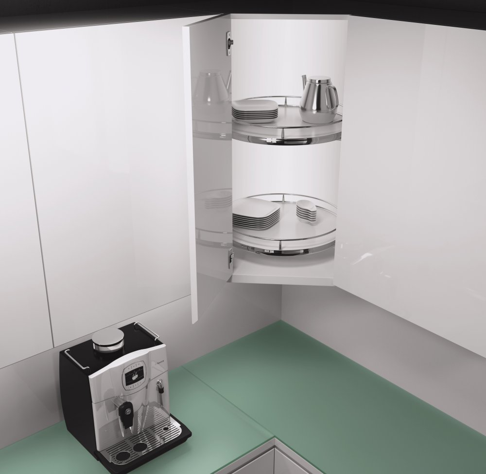 - thanks to the rounded shape of the shelves, the carousel tends to “travel” outside the furniture, delivering all the dishes straight to your hands;