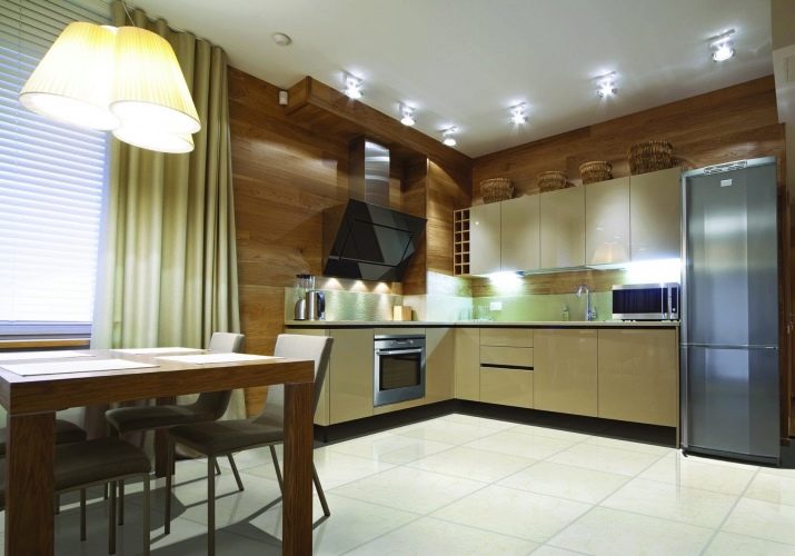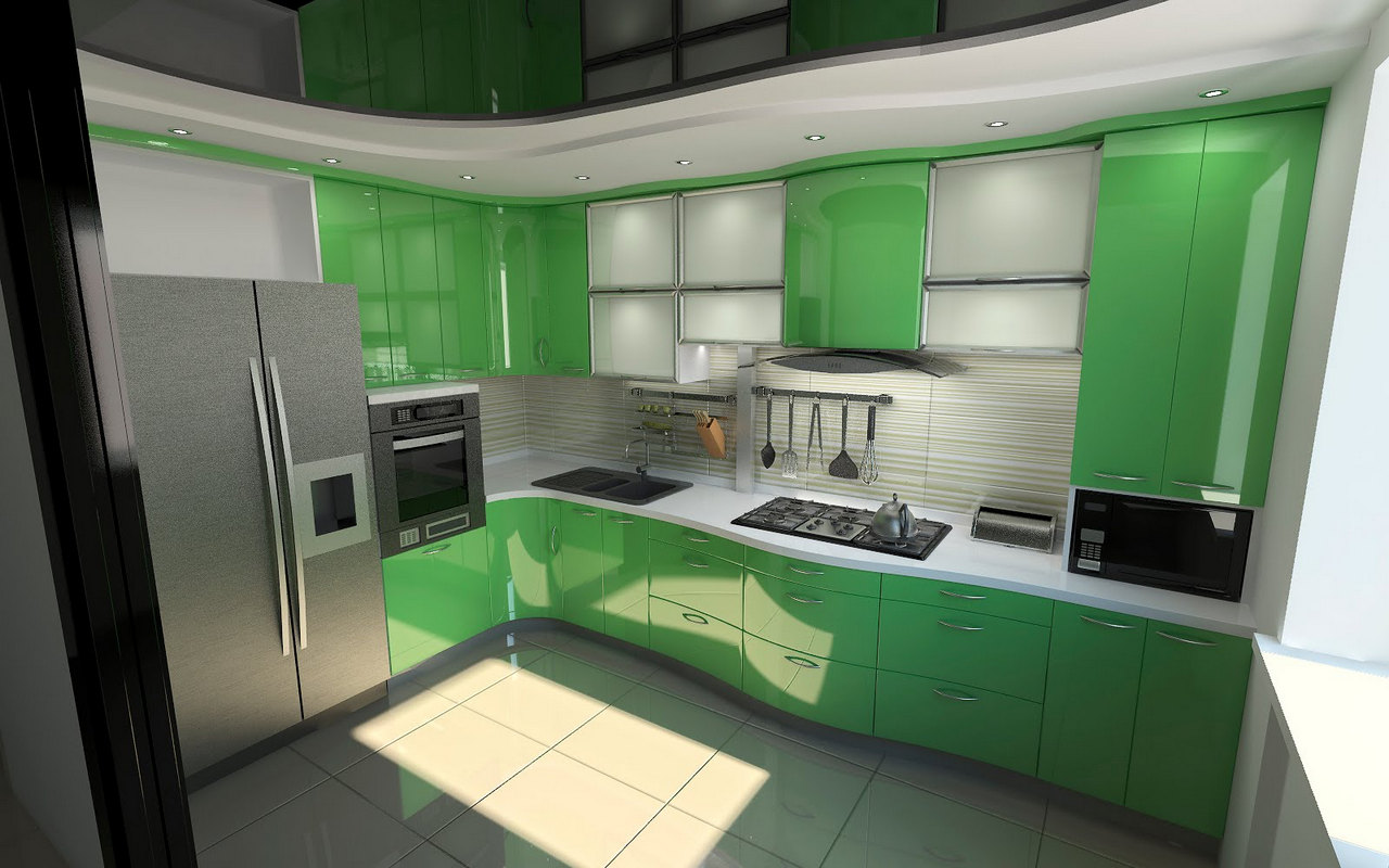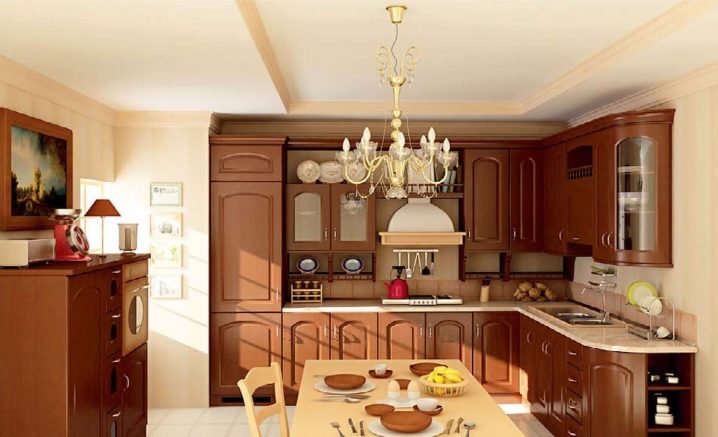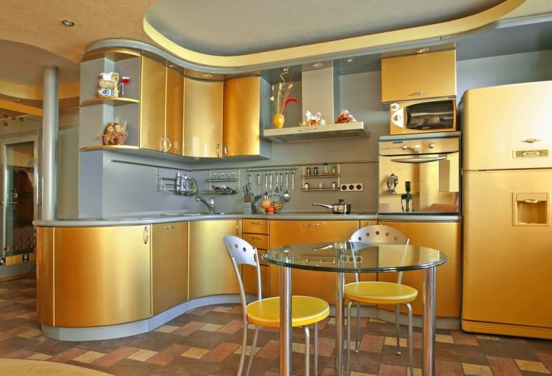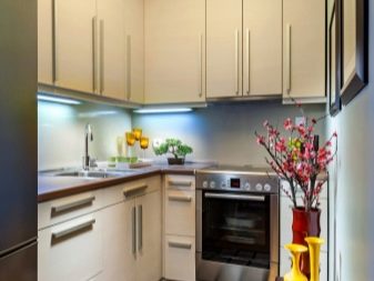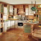 Corner constructions also look good in the kitchen, they not only cover the corner of the room, they are roomy, but also occupy a minimum of space. Although the main material for the manufacture of kitchen cabinets is considered to be natural wood, most often in furniture production they use MDF and chipboard. This material is inexpensive, environmentally friendly and characterized by durability.
