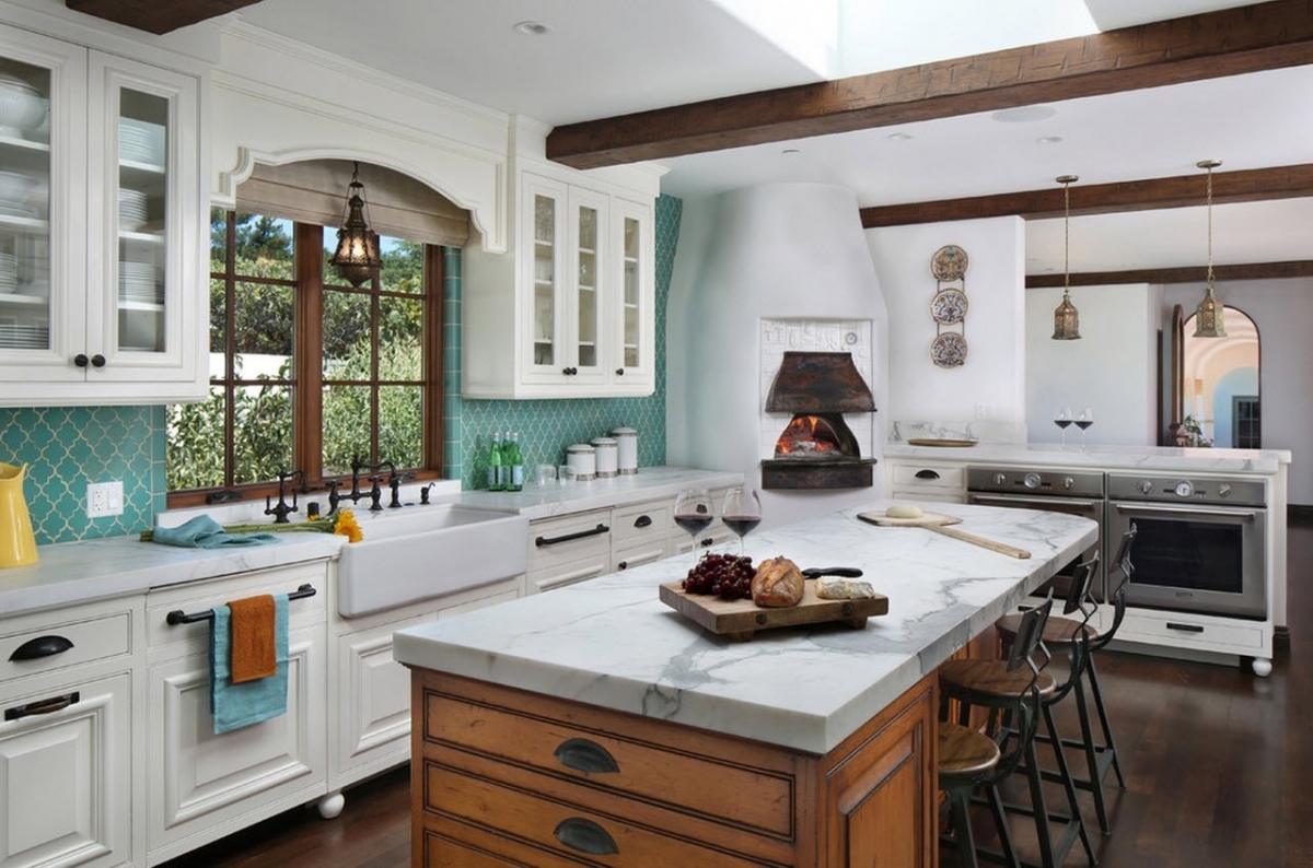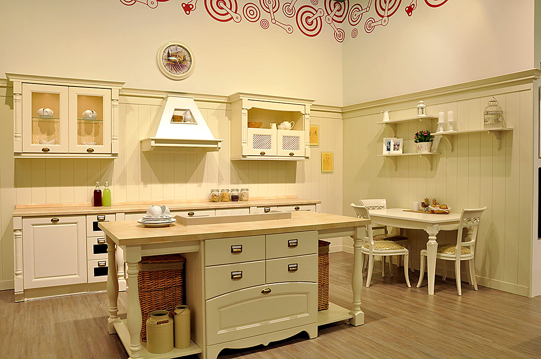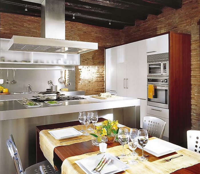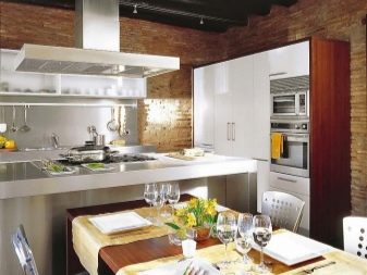 With open shelves. Recently, in the design of the kitchen began to use cabinets with open shelves. This is not only the most fashionable trend, but also a piece of furniture that allows you to free up a small kitchen space from bulky wall cabinets. In addition, such models provide a convenient placement of dishes and visually increase the size of the kitchen. Open shelves look original in the kitchen, decorated in the Scandinavian style and Provence style. Such cabinets are well suited for combining kitchen and living space. It is recommended to install open cabinets on walls of monochromatic colors, while the base of the walls can be decorated with ceramic tiles and plastic or wood paneling.