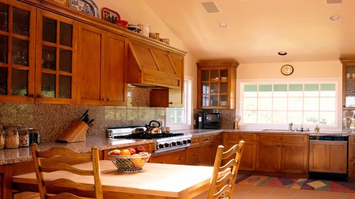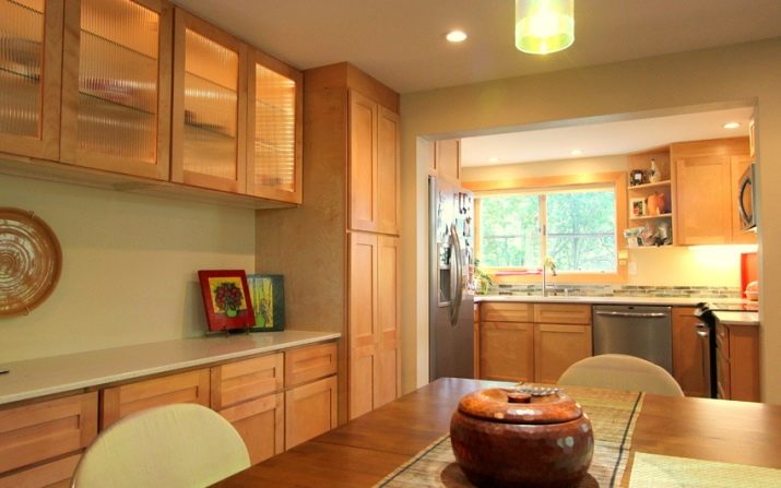 When installing the kitchen unit, first of all, pay attention to the height, as well as the distance between the table and the cabinet.In addition, you need to take into account the characteristics of the kitchen, the average height of which can be 180-200 cm. If the cabinets are set above the norm, then their shelves will be high and inconvenient to use. The maximum height of the wall cabinet within 190 cm is recommended.