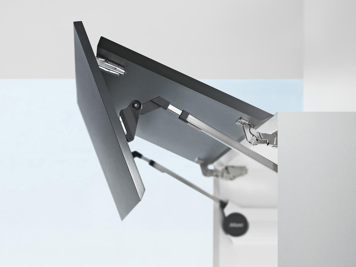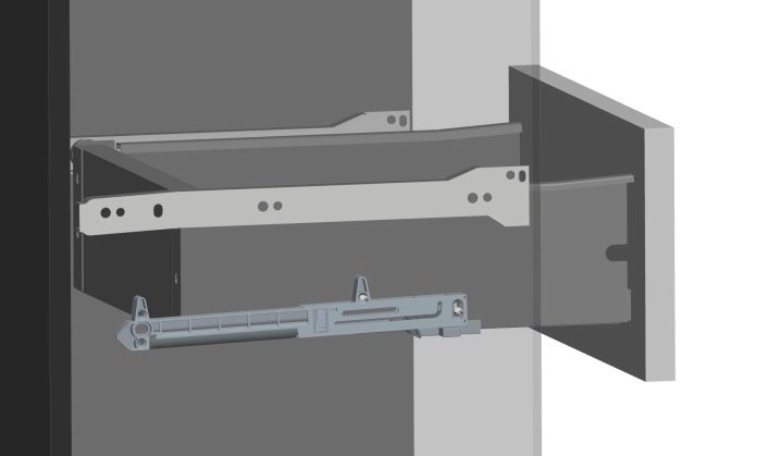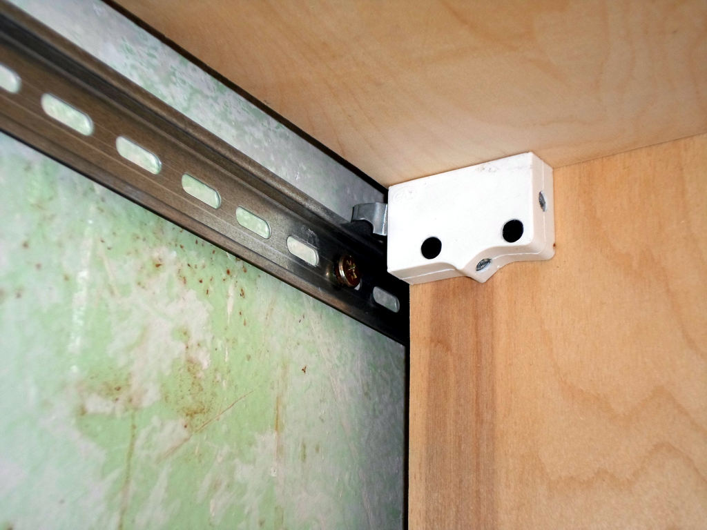 The suspension is angular, unregulated. It is mounted on the top wall of the cabinet. At the same time, using an oval mounting hole, it is possible to adjust the distance of the drawers to the wall. But a significant drawback lies in its visibility not only from above the cabinet, but also when opening the doors inside.