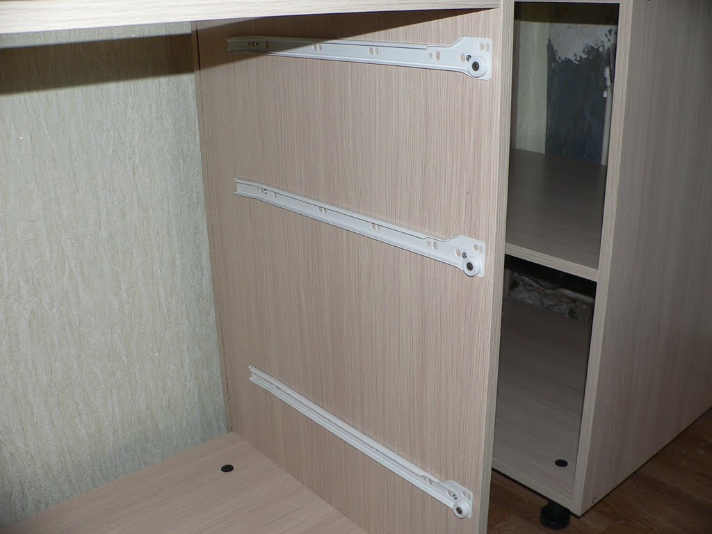To do this, initially we make a hole in the back wall, push the foot into it. After that, having pressed it against the upper wall of the cabinet, fasten the fasteners to the side of the drawer. There is a small nuance here. If the back wall of the cabinet is made of laminated chipboard or MDF, then the hole must be made entirely under the suspension box and fixed flush with the outer side of the plate, otherwise the fastening loop will not block the back wall of the drawer and it cannot be hung.