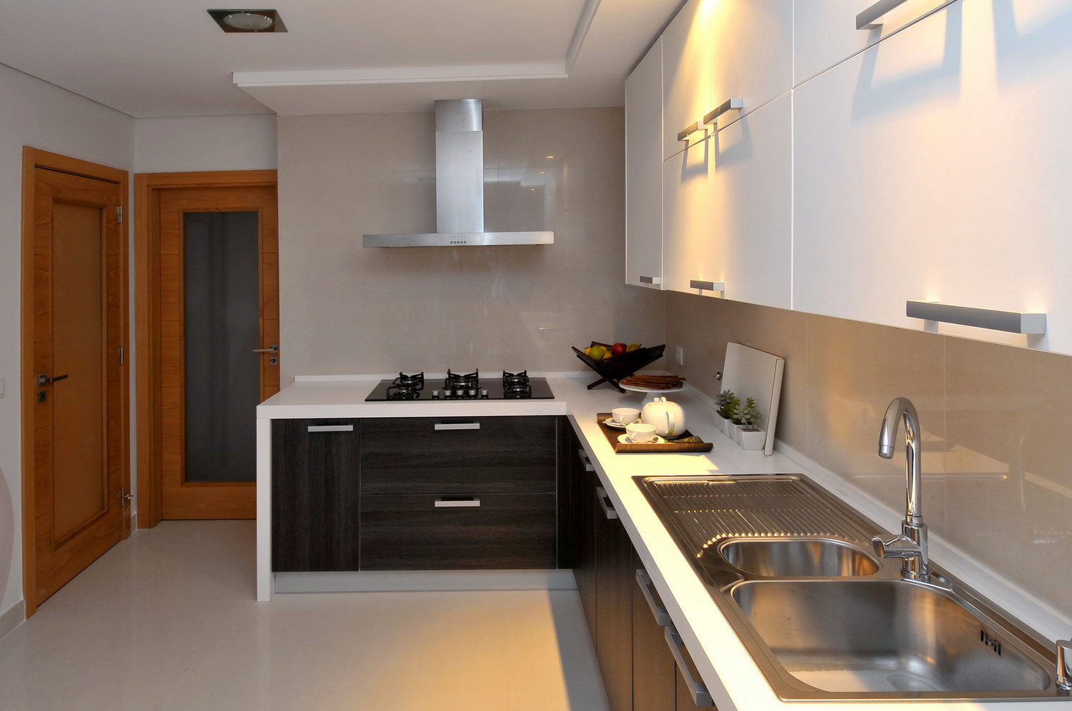 Another of the attributes on which the distance between the cabinets depends is the height of the ceilings. When this value is minimal, it is desirable to use also the minimum dimensions of all elements.