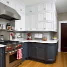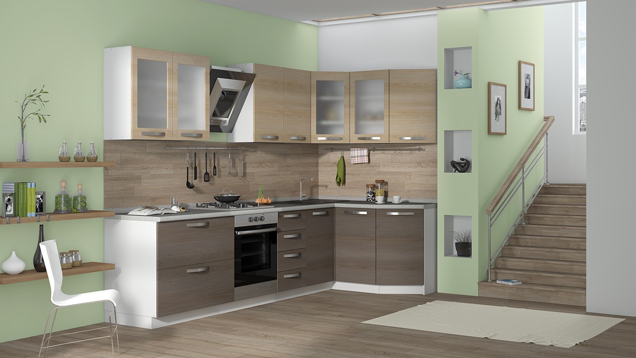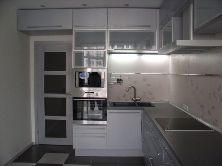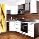 Corner cabinets in appearance are divided into three main types: straight, L-shaped, trapezoidal and radial. In various projects, direct mounted models, located on one wall, side wall attached to the angular module or adjacent directly to the other wall. This is a classic universal design option for the kitchen of any size.