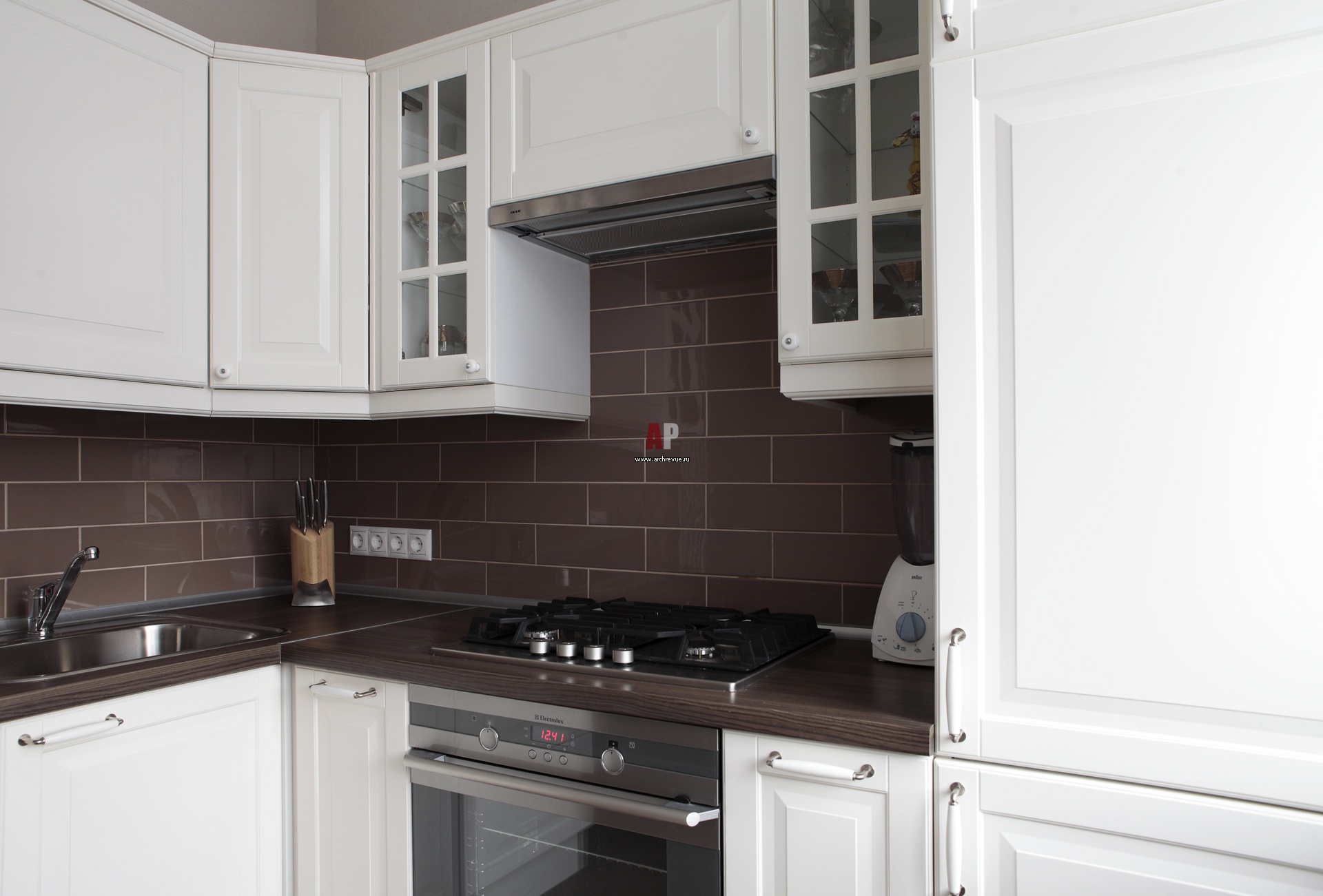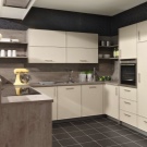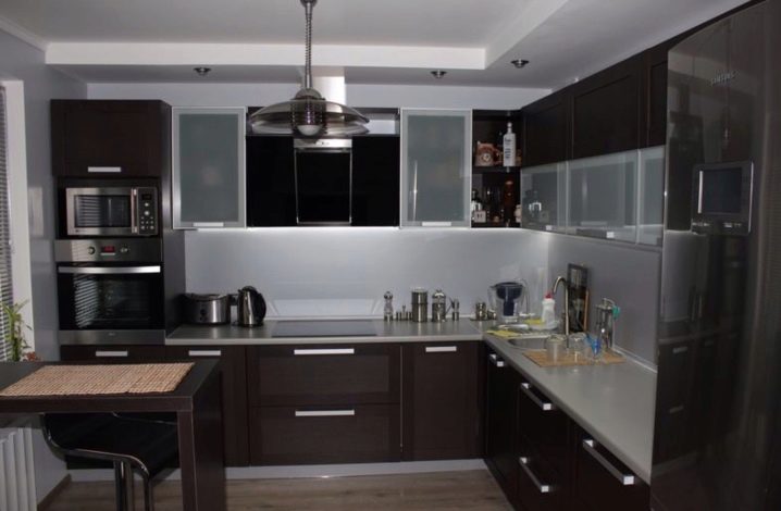 Modern corner kitchen is a great solution for a small kitchen. It creates a practical and ergonomic layout that forms a working triangle in the kitchen. Moving within the boundaries of the working triangle during cooking, the hostess has on hand a stove and a refrigerator, as well as a sink for dishes, which, to save space, is most often mounted in a corner floor cabinet.