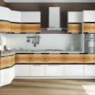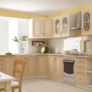 Corner cabinets are distinguished not only by the shape, but also by the material of the facades. Classic kitchen facades can be made from an expensive array of various types of natural wood: cherry, beech, pine, ash. In modern models used aluminum facades with inserts of transparent, frosted, patterned and colored glass.