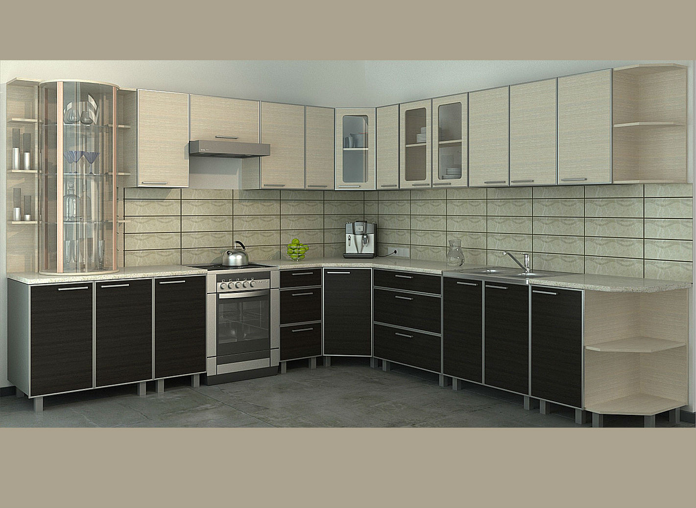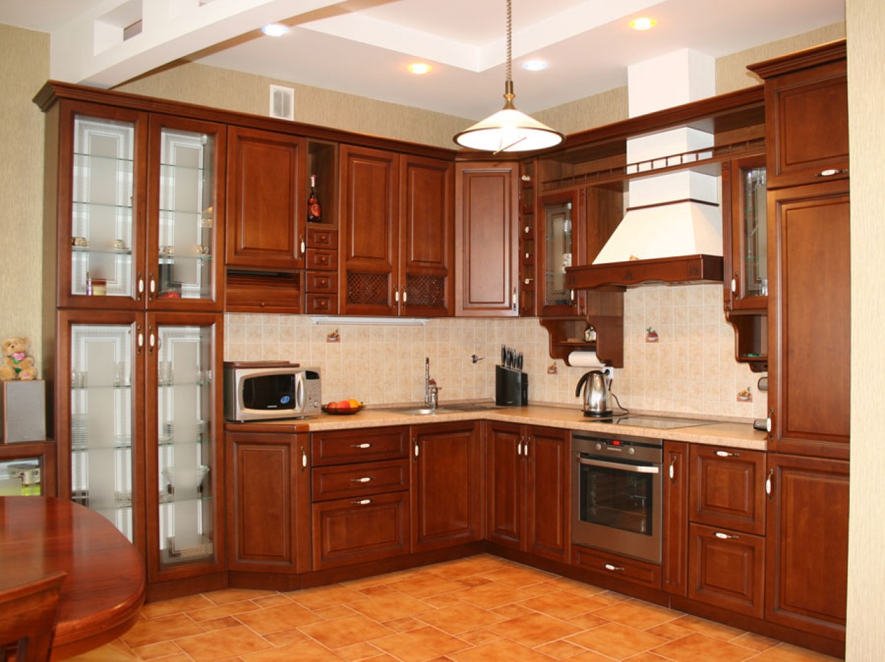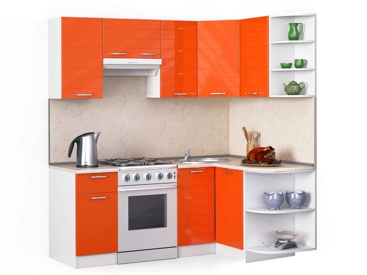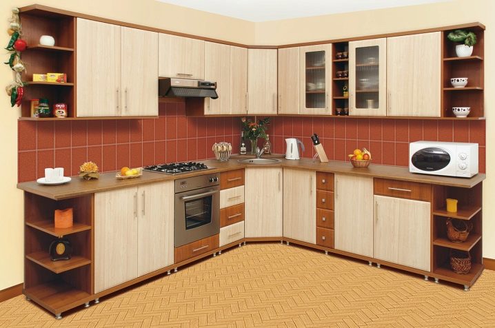 For optimal use it is very important to decide on the “filling” of the module. Corner cupboard can be used not only to store dishes. In the cabinet, which has open shelves, you can arrange small appliances, figurines or place a small TV, which will be convenient to watch from anywhere in the kitchen.