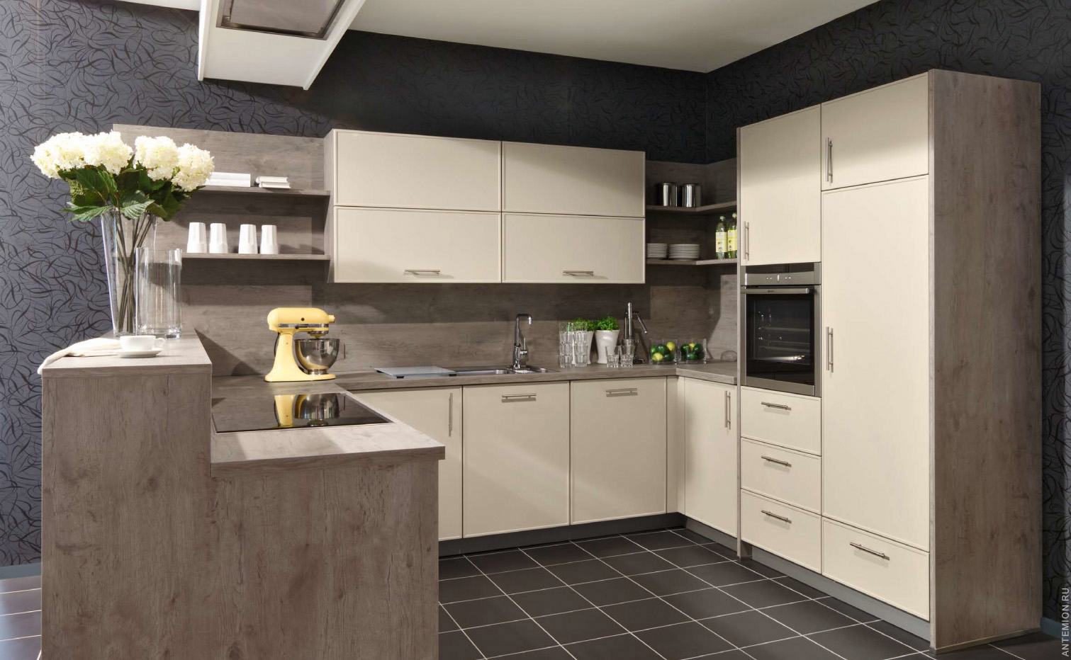 In modern kitchens, various mechanisms can be incorporated into the deep corner module to facilitate access. For example, carousel, made of baskets, shelves and pallets fixed on the axis. Revolving, this system makes it easy to get the desired item from the depth of the cabinet.