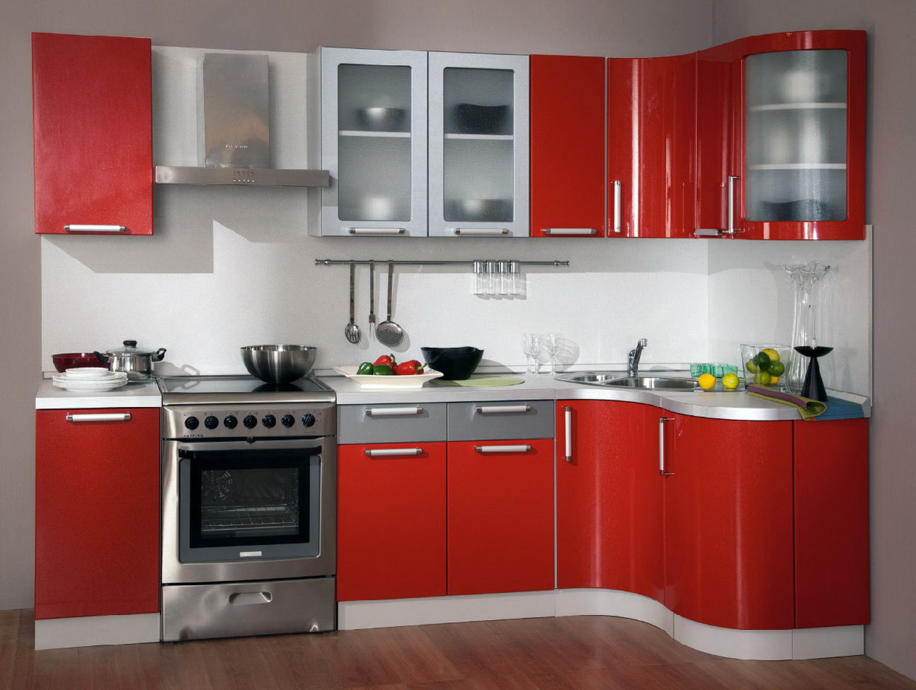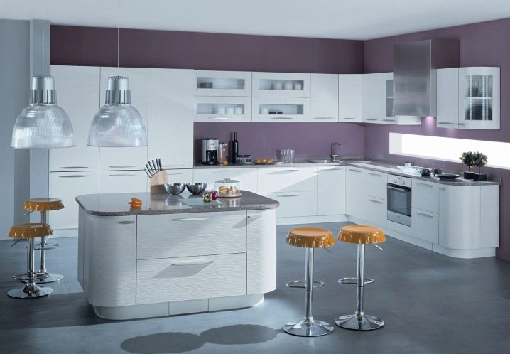 The radial hinged case has the form rounded inside. This option can decorate and make a more comfortable kitchen of any size. Making curved radius facades has only one drawback - high cost.