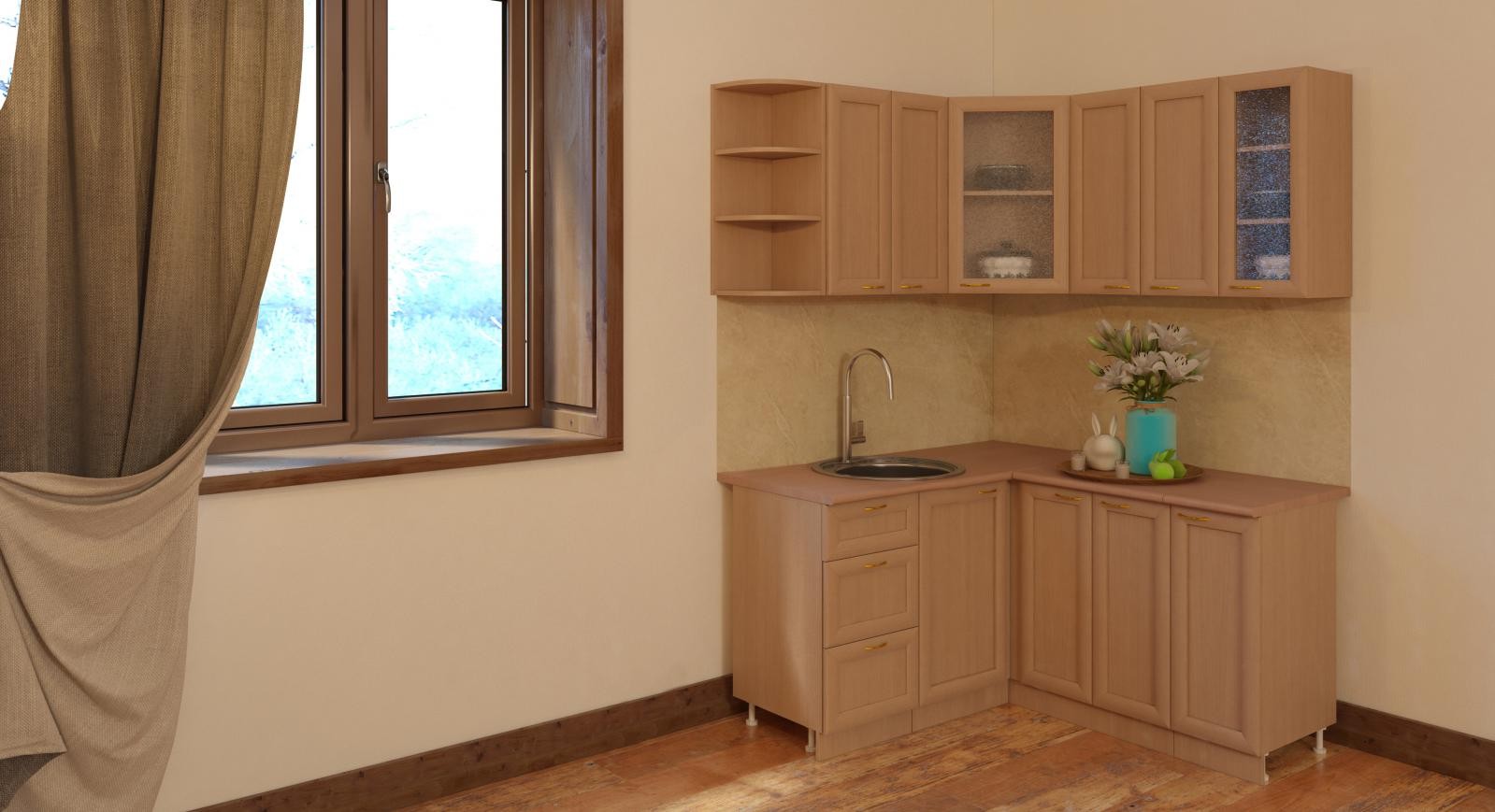 Harmoniously completes the angular space of the hinged L-shaped cabinet, creating a continuous ensemble of a kitchen set. It is not necessary for the cabinet doors to be opaque. If an elegant tea set is stored in the cabinet, transparent doors will accentuate the beauty of the dishes and visually add light and spaciousness to the kitchen. The use of lighting will be an additional advantage to the design of the kitchen with oneby the window.