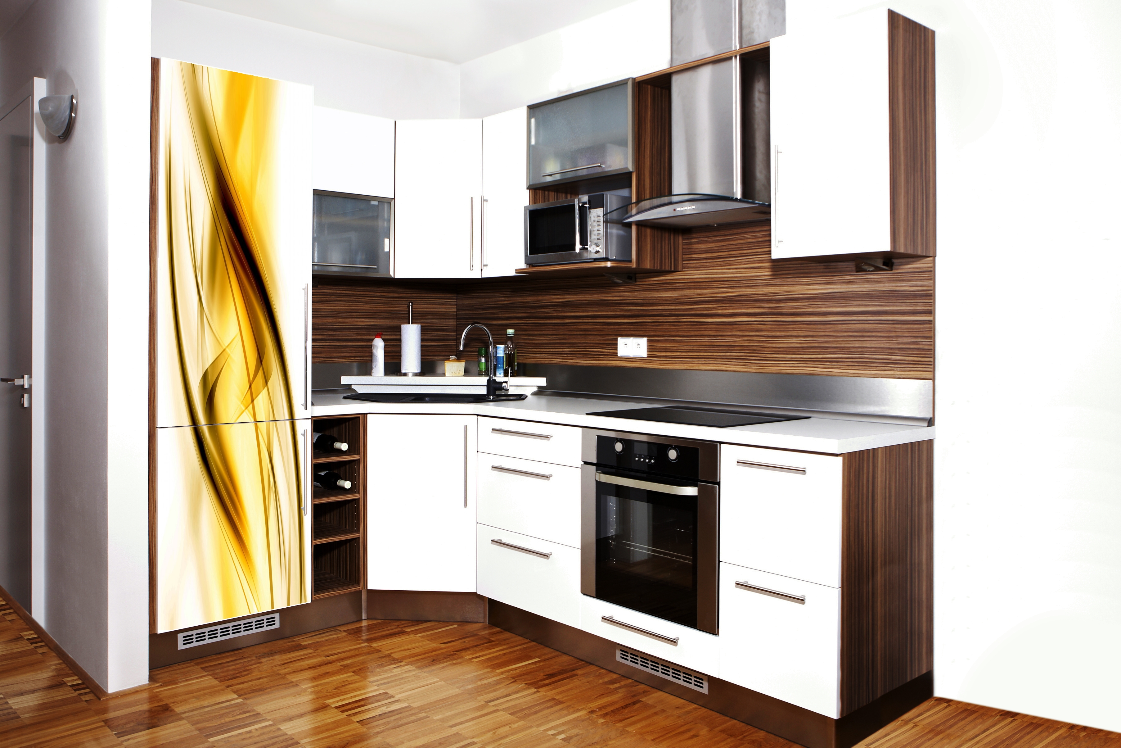 - contributes to masking the irregularities of the walls and the corner of the kitchen.
