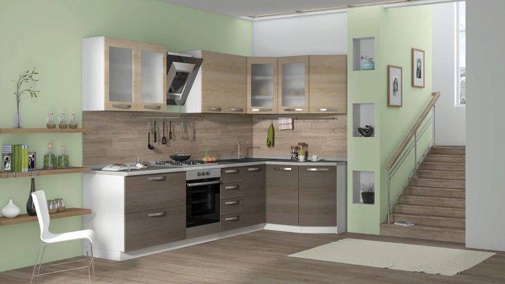 The corner wall cabinet for the kitchen, completing well with the corner floor cabinet and expanding the functionality of the corner space, has a number of positive qualities: