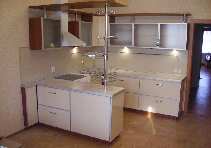 The “kitchen corner” mechanical system is becoming very popular, the shelves of which move forward and turn after the opening door. When closing the door, they hide in the locker in the reverse order.