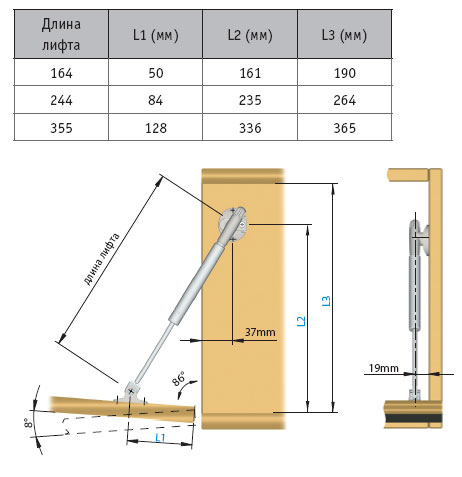 The figure shows a schematic illustration of the installation and the table of correspondence of the installation dimensions. This shows the installation mechanism when opening the door down.Installation of the rising door is done in exactly the same way. First of all, the compliance of the selected equipment is checked: for a wall-mounted cabinet with an internal cavity height of 365mm, a gas lift with a size of 355mm is required.