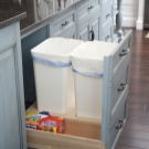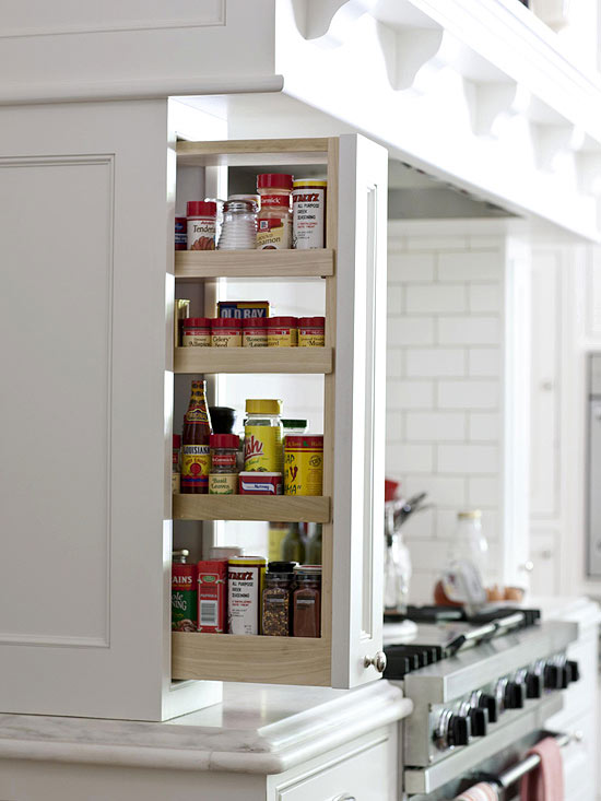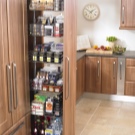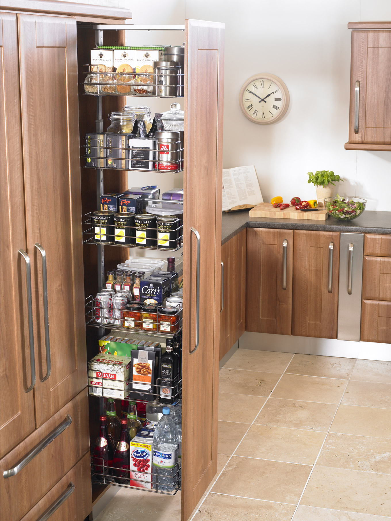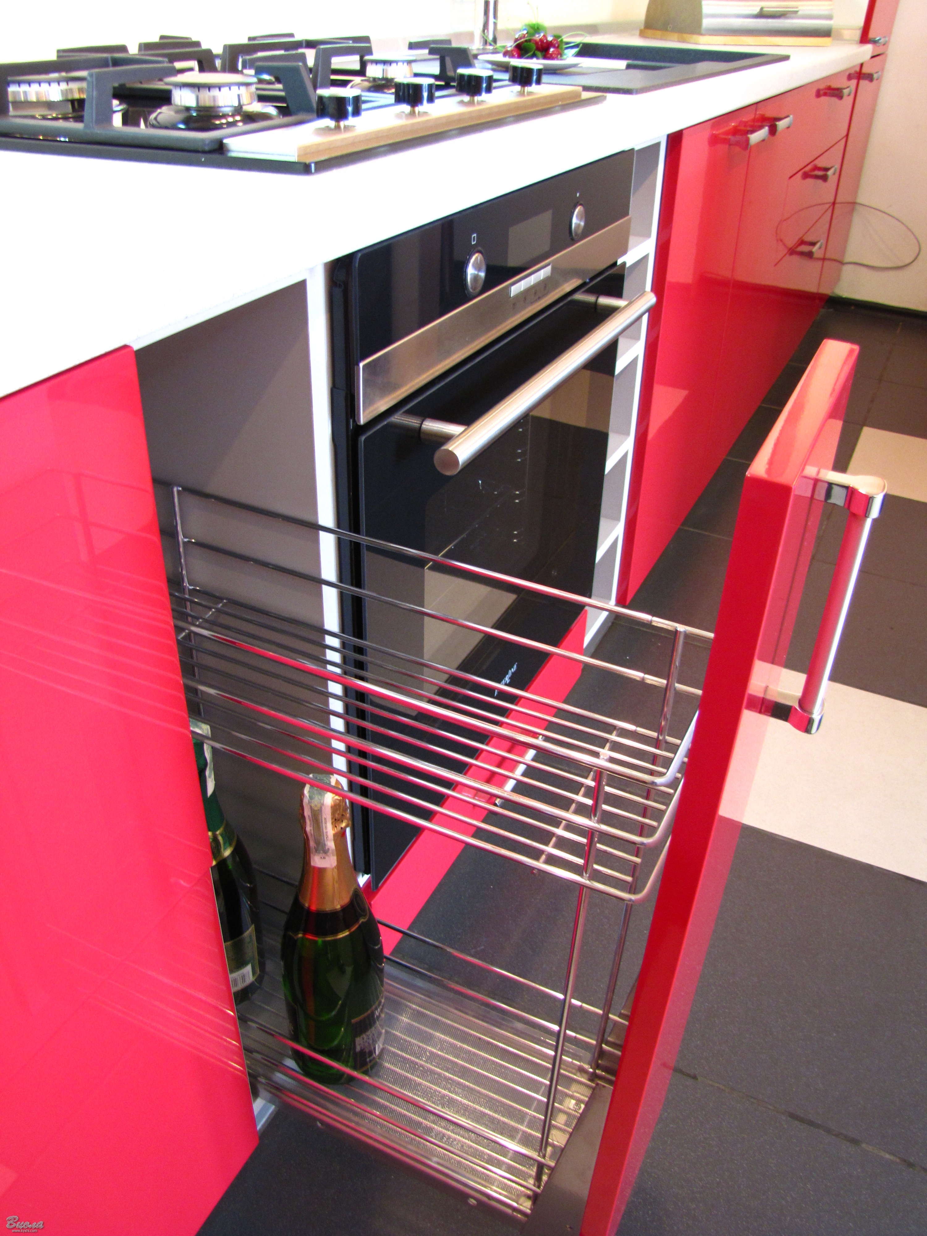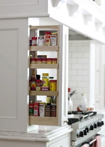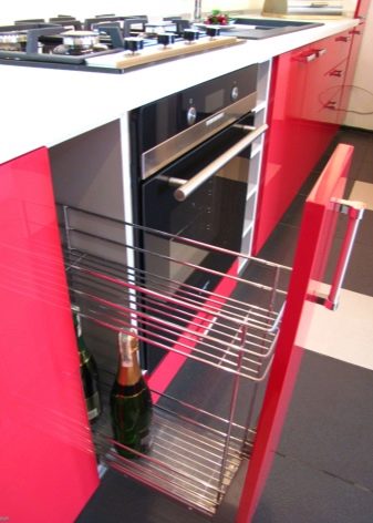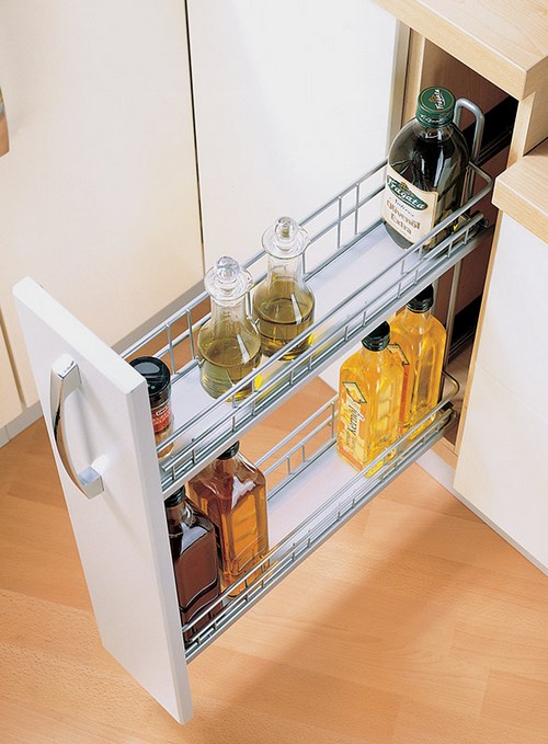 One of the modern popular solutions are cargo boxes. This is an original prototype of a standard sliding system, but a distinctive feature is the width that does not exceed the mark of 20 cm. Basically, the boxes are designed for storing various cans and bottles.