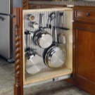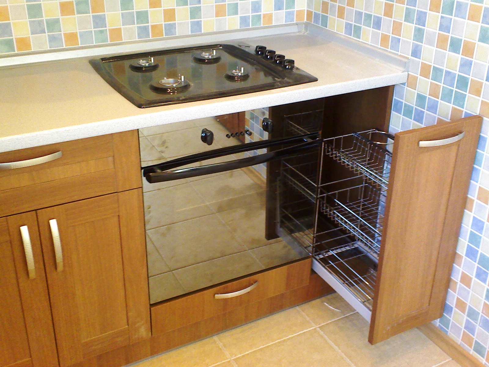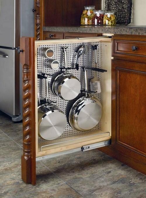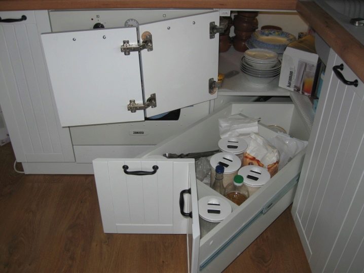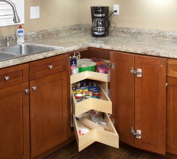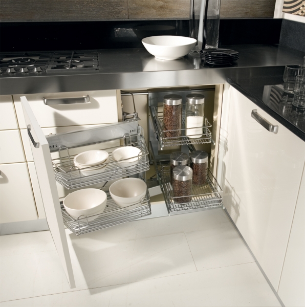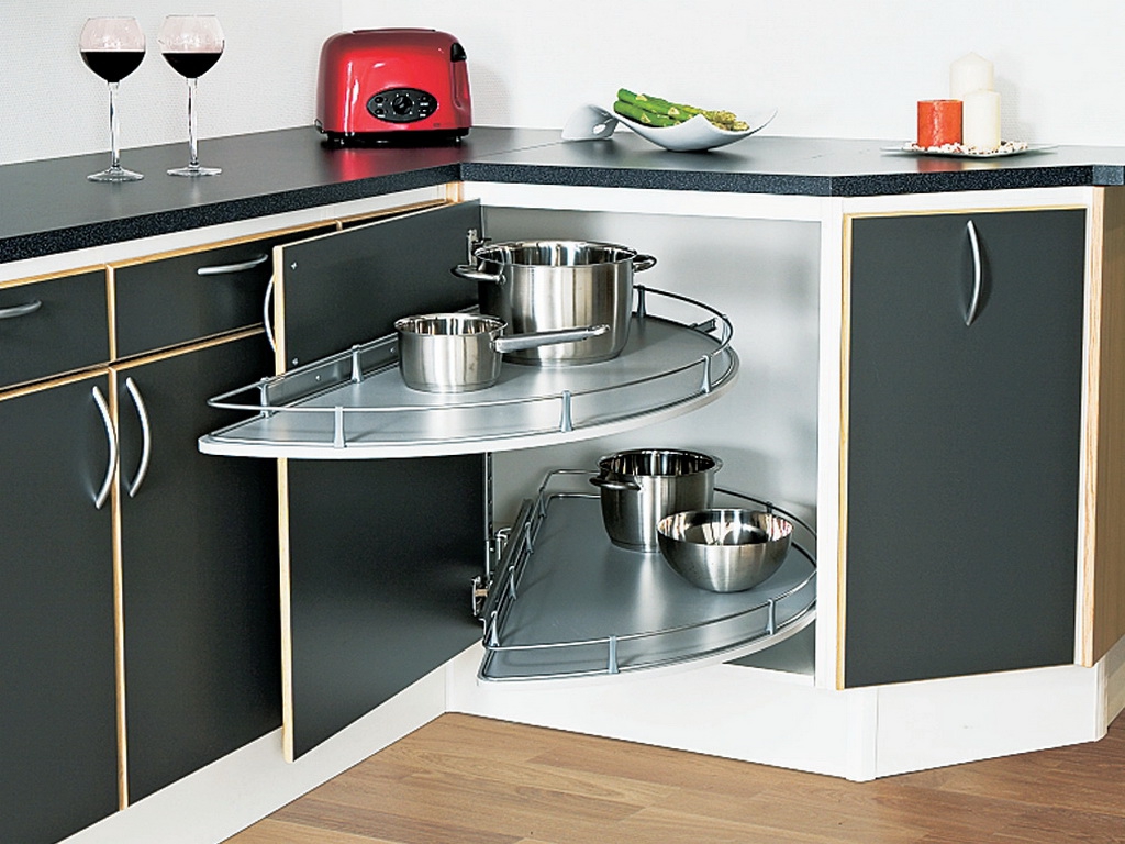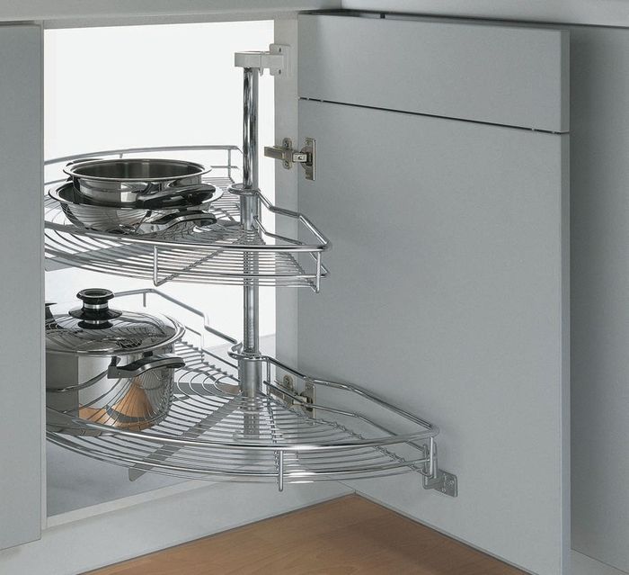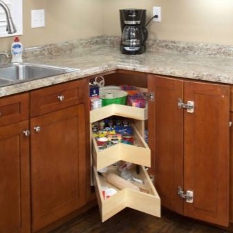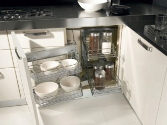 Save a large amount of space in the kitchen allow the system type "carousel". The whole structure is located on the cabinet door or on its side. When opened, all drawers roll out.