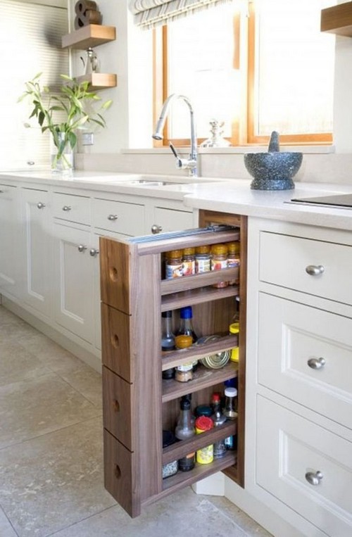 Basically, drawers are embedded in floor or hanging cabinets. It is not only convenient, but also beautiful. All you need to do is open the door, after which shelves appear with everything you need. This is quite convenient in cases where you need to quickly find something.