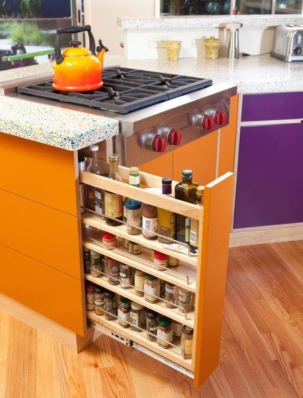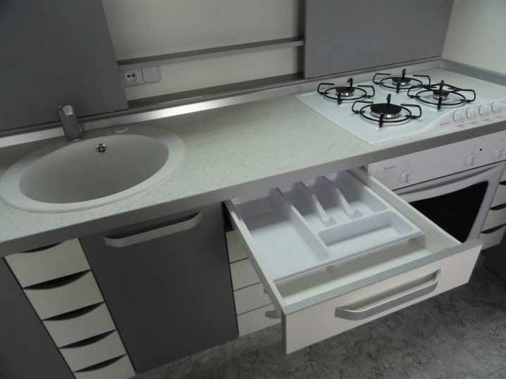 A good option would be to use vertical narrow boxes. They do not take up much space, are easy to use and most functional.The basis of these options resembles cargo boxes, but the main difference is the lack of shelves. Instead of these compartments, the interior is equipped with special containers for storing cutlery. Basically, vertical drawers are installed next to the sink.