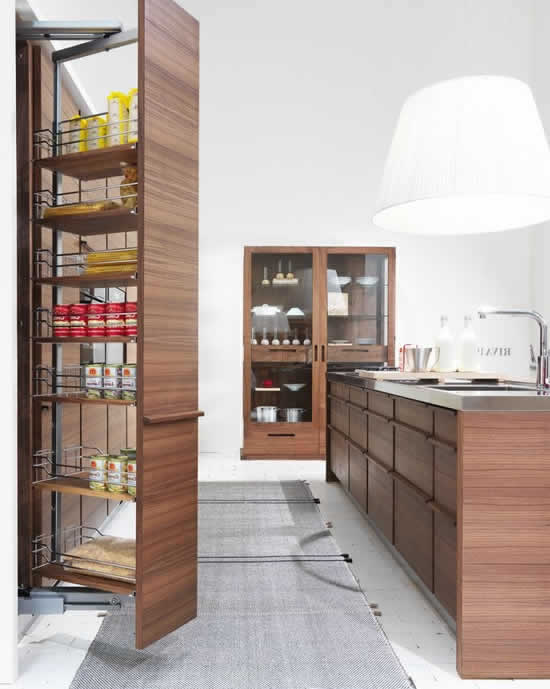 Choosing retractable systems for arranging the kitchen, you need to understand that their main goal is maximum space saving. The most popular in modern design is a hidden view. The main advantage of such systems is that the arrangement of drawers and shelves does not damage the design of the kitchen. At the base are used corner structures, various lockers and even storerooms.