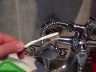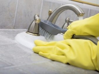 Strongly contaminated surfaces can be cleaned, taking 1 tablespoon of wheat flour, 6% of vinegar and salt. The resulting gruel is applied to the mixer for 10-15 minutes, after which it is washed off, the surface is polished with a soft microfiber cloth.