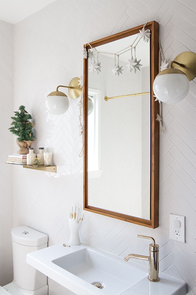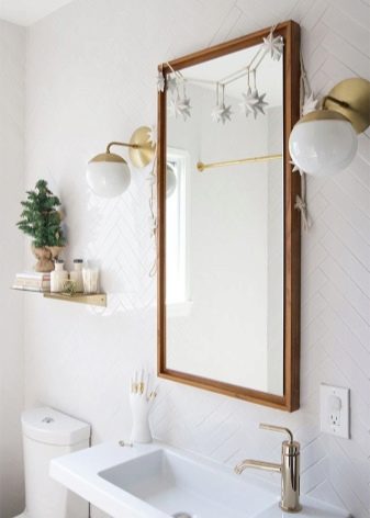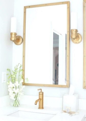 Somewhat expected, but, on the whole, the combination of a bronze mixer and a mirror frame, wall sconces looks quite attractive.