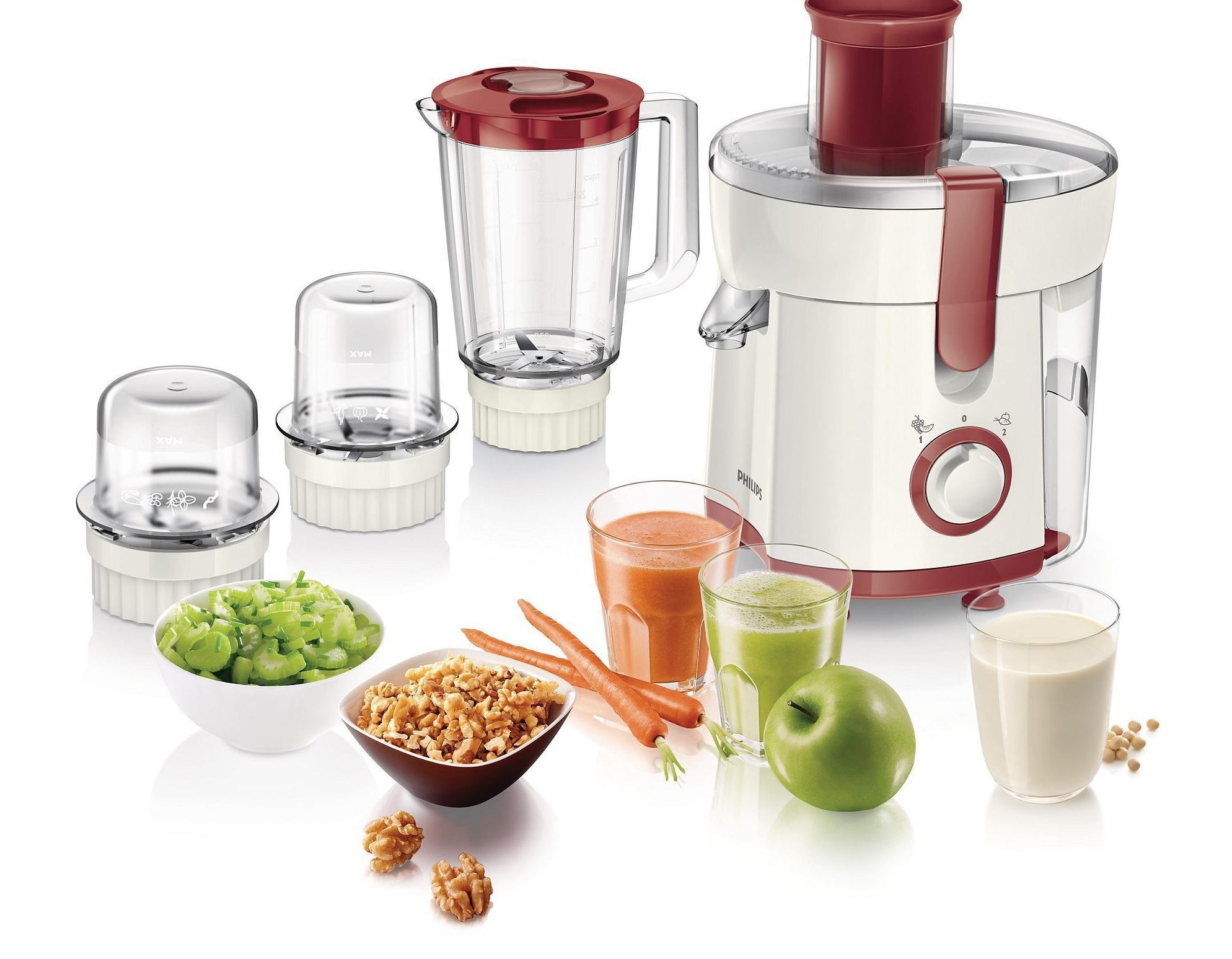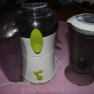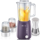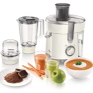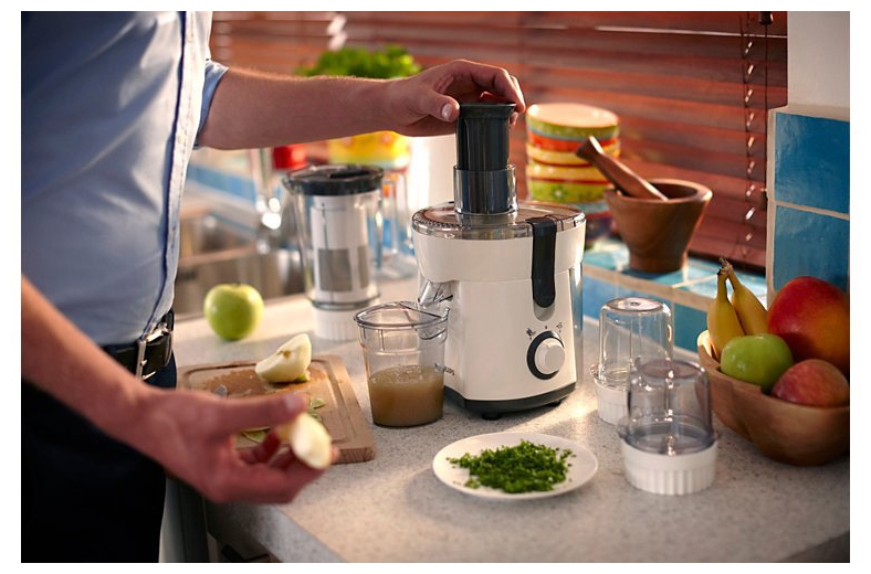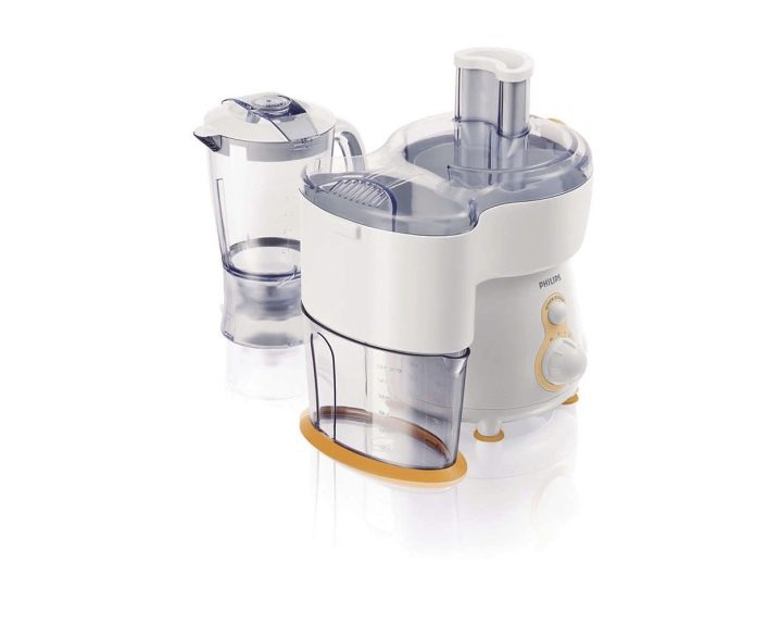 Philips HR1840 / 55 blender and juicer has good reviews. A jug for juice, a container for a blender and a brush for cleaning the device are included in the package.It has a speed and power regulator for grinding or spinning, as well as an interesting and stylish design. In addition, on the basis of this design, there are comfortable legs with suction cups that protect the appliance from falling, since during operation such devices vibrate strongly and can easily slide out of the kitchen working surface.