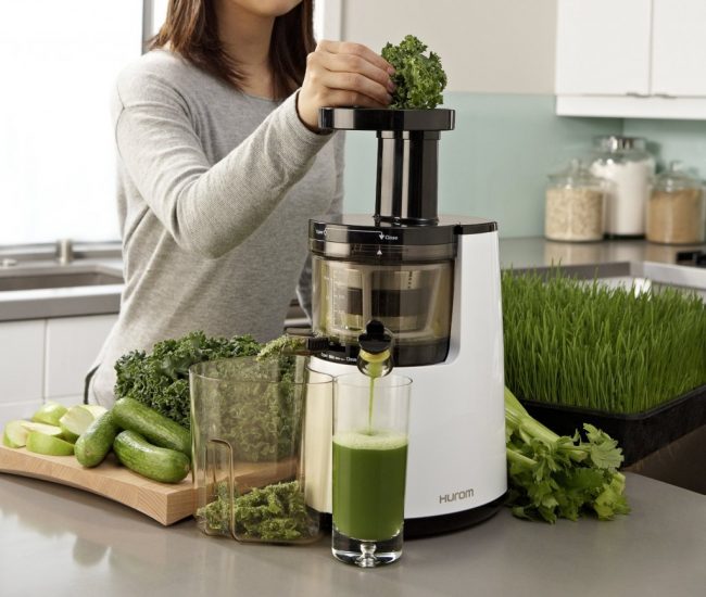 Horizontal screw models are best suited for making grass juice. They can cope with any other products easily. In addition, horizontal models, as a rule, have various additional nozzles and functions. The disadvantage of horizontal juicers is that in the process of work can not do without the use of the pusher.