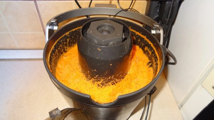 A negative factor is the fact that when using a centrifugal juicer there is a large consumption of products due to the fact that juicy cake is deposited on the walls of the device.This happens because of the mesh clogging. As a result, you often have to stop the juicer, disassemble and wash the mesh. It is rather difficult to wash the strainer, as it consists of the smallest holes.