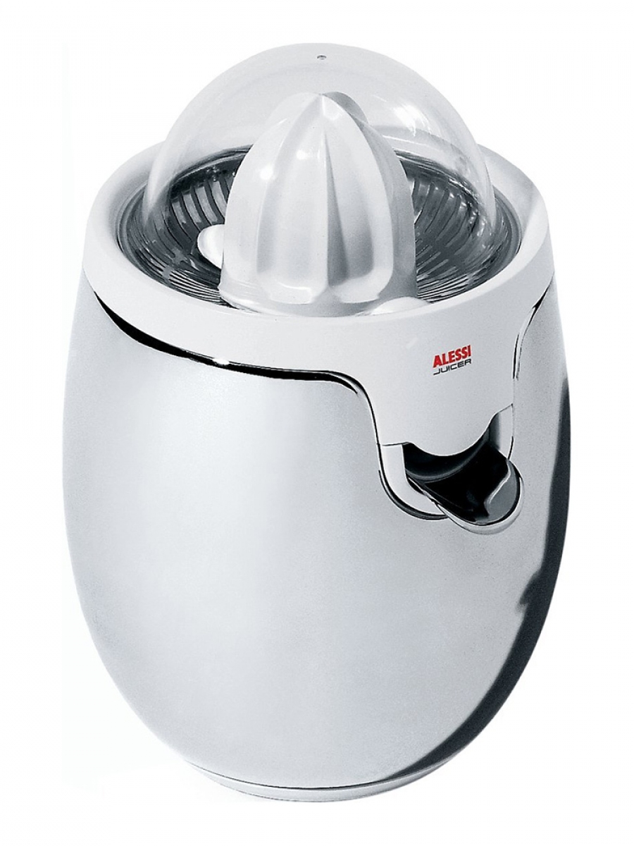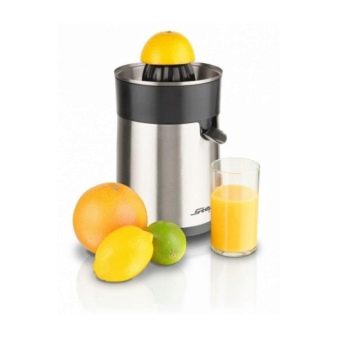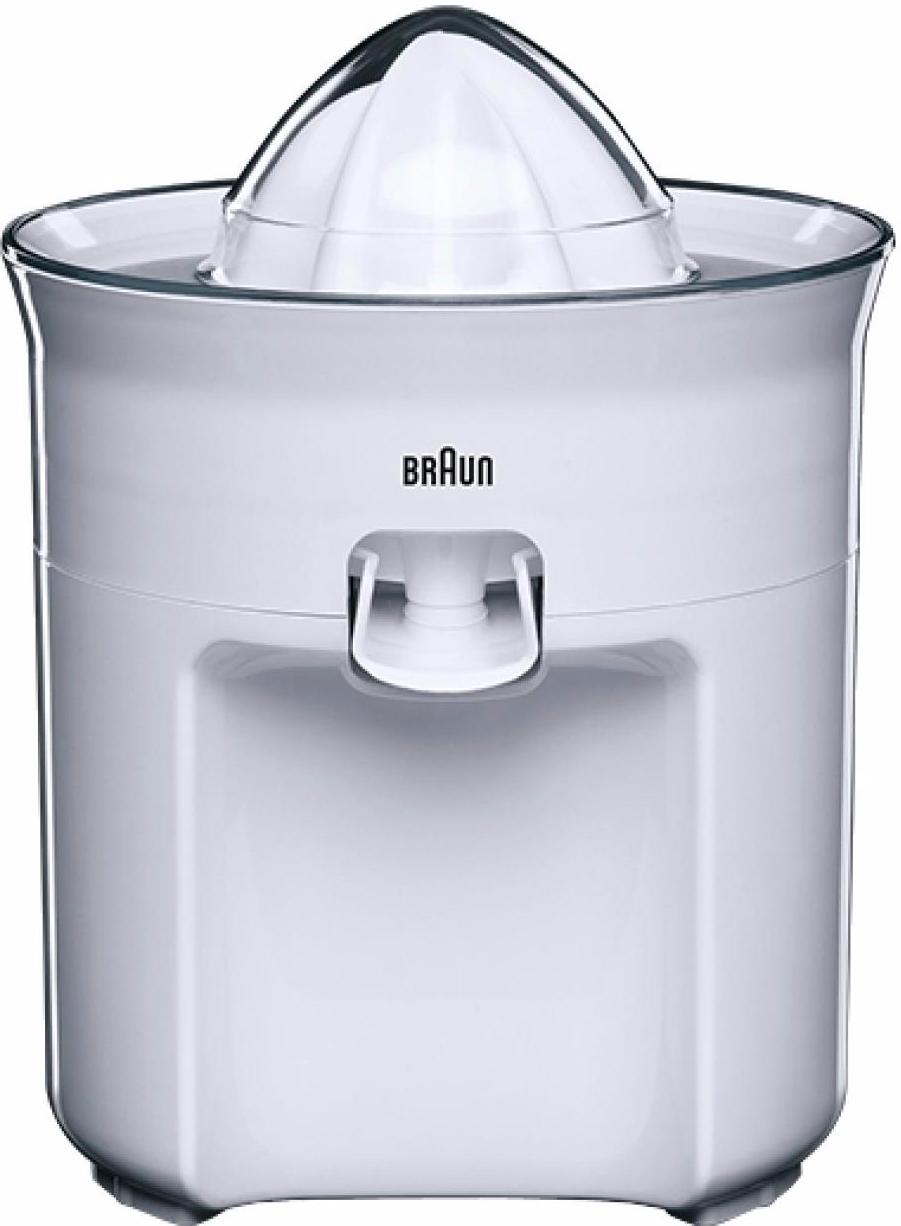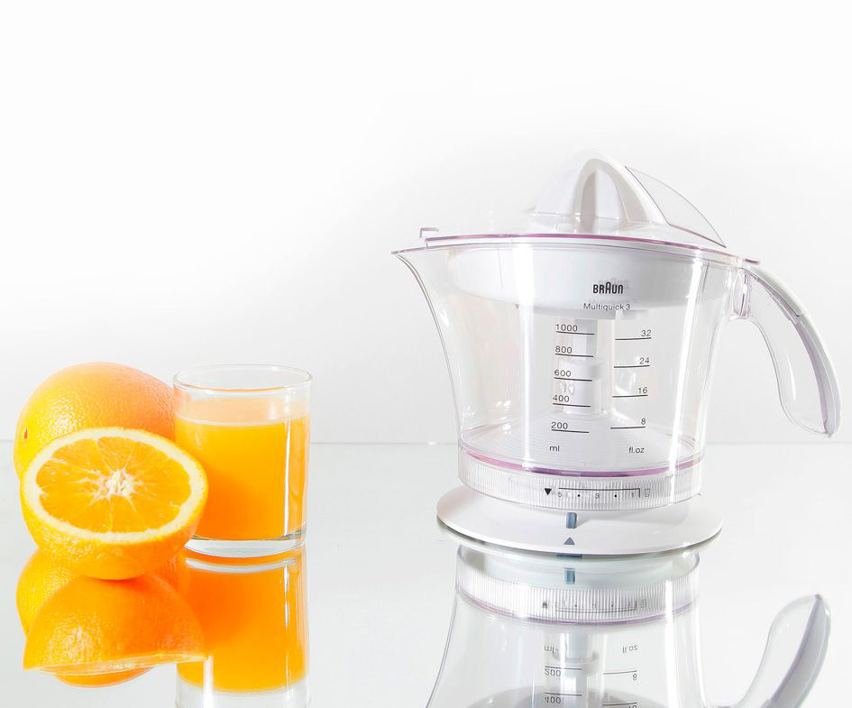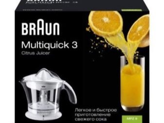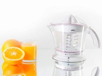 The most popular version of the budget electric citrus juicer is the compact cone press Braun MPZ9 with a convenient removable liter jug to collect the finished juice, with a quiet motor power of 20 W and a maximum screw rotation speed of 59 revolutions per minute.Made of light food-grade plastic, equipped with a system for adjusting the consistency of pressed juice and a lid to prevent dust from entering.