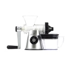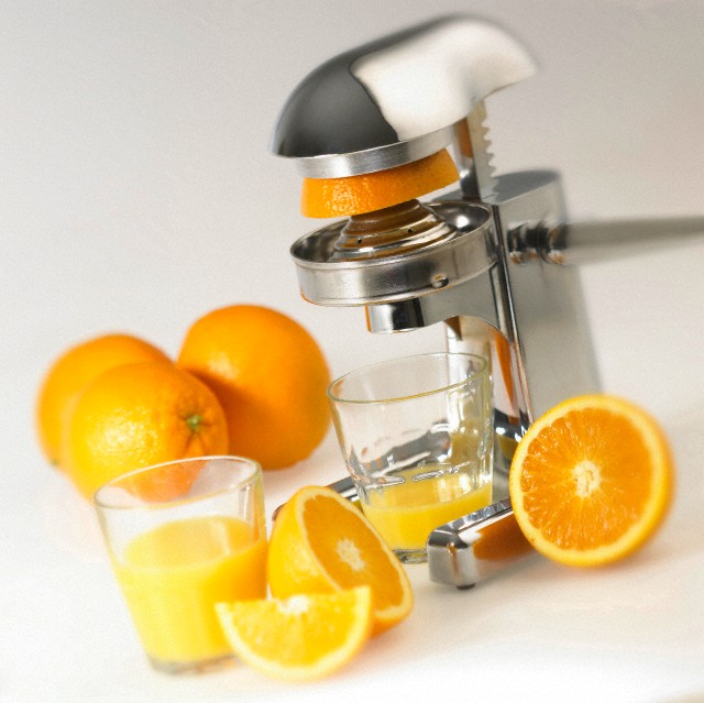 A fully manual juicer and a kind of manual mechanism, a citrus press juicer, are on sale. This model is a cone and a device by which the fruit is pressed. Squeezing out the juice in this way will not have to make much effort, and the juice will squeeze out at 100%, leaving an almost dry skin from the orange.