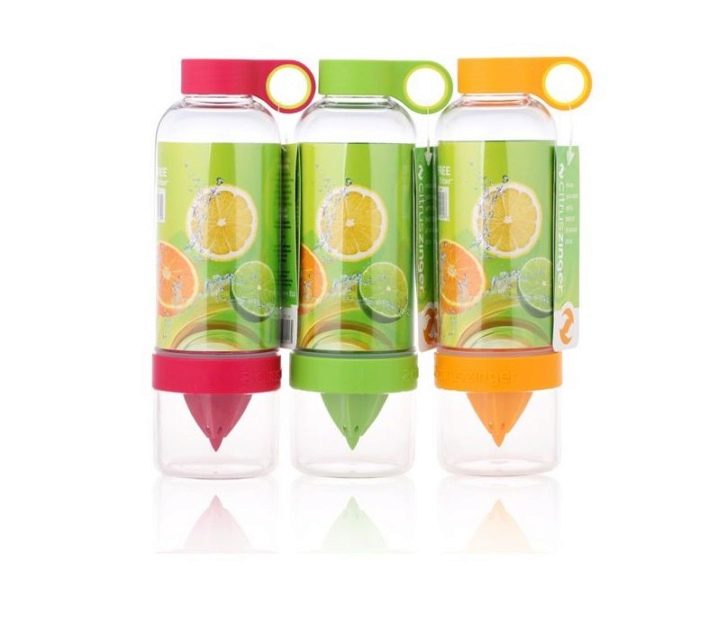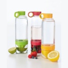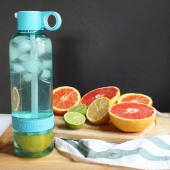 The plastic model Citrus Zinger (Germany) is compact and light, you can take it with you, for example, for training or for a walk, and you may need it when traveling. Material of manufacture of this design - food grade plastic with silicone. On the neck and at the bottom - connection by means of thread. Very attractive design.