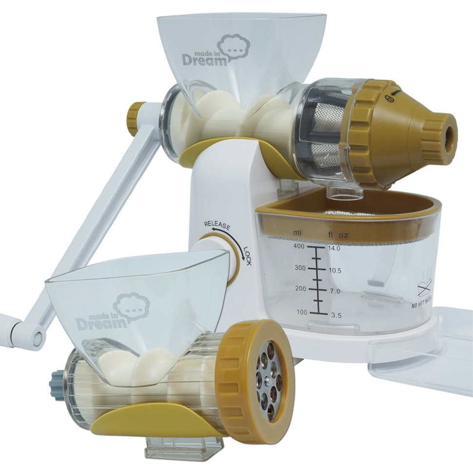 This model of manual juicer has a volume of 600 ml, the production material is impact-resistant food grade plastic (polypropylene), which is environmentally friendly with all the necessary standards.It can be made in any color scheme, yellow devices, maroon, blue, orange, green look equally beautiful. Just take care of the device - even a dishwasher will do. The model is convenient and practical.