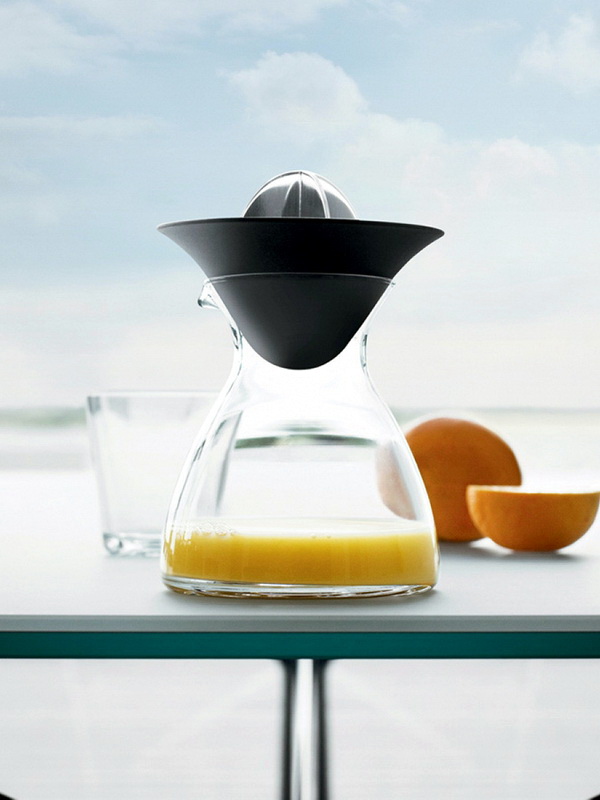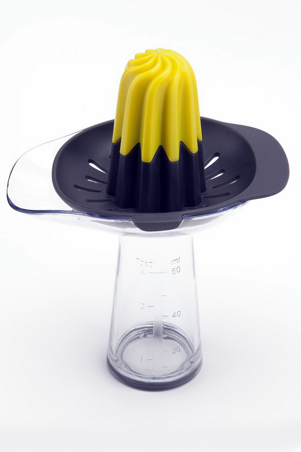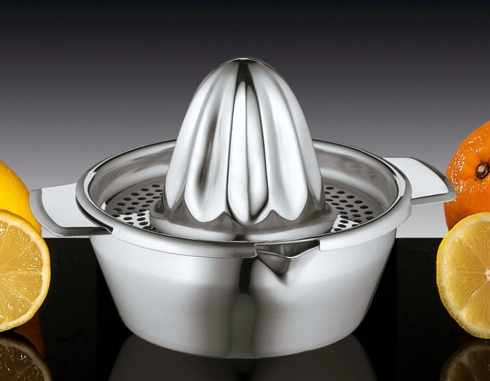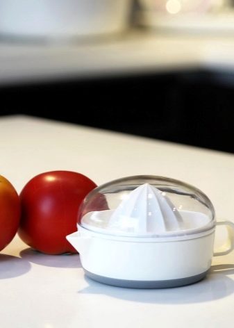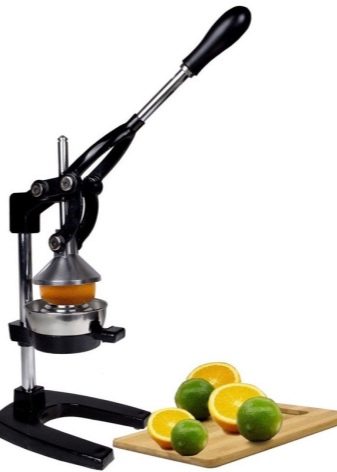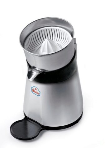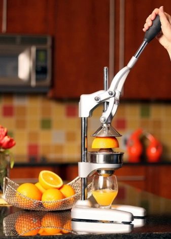 Also included in the kit is a vessel for assembling the obtained juice. There is one more kind of such a juicer, the device of which can be activated with the help of a special lever. He presses on the citrus fruit on the top of the cap, in which you can squeeze the juice from the whole fruit.