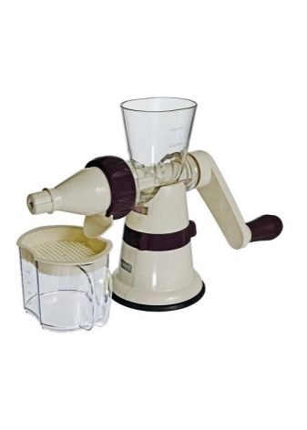 There are several types of manual-type juicers: horizontal auger, citrus juicer and various presses. Separately, you can select a mechanical model for apples and a device for berries. Screw devices look like a meat grinder, they have a mechanical device, they are controlled by the hands according to the principle of the twist of the meat grinder handle, and the fruits and vegetables that are inside give the juice under a large press.