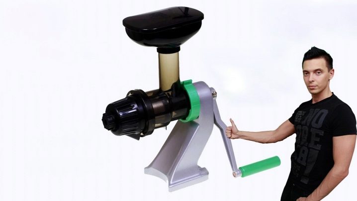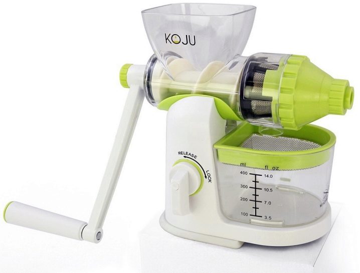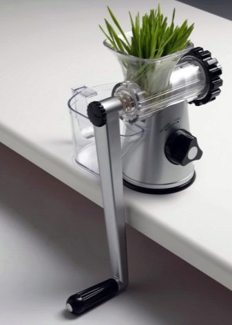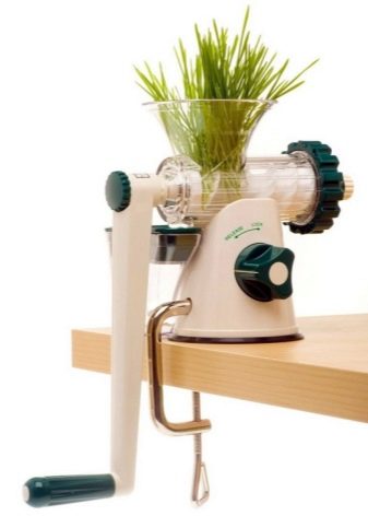 The screw juice extractor is arranged as follows: in the center there is a spiral-shaped axis, which turns when turning the outer handle, grinding and pushing fruits or vegetables into the special compartment of this device. There, the pulp under pressure is squeezed through the mesh, and then the juice is poured into a glass. This juicer works like a slow press, so it can squeeze the juice from any plants and fruits.