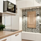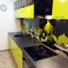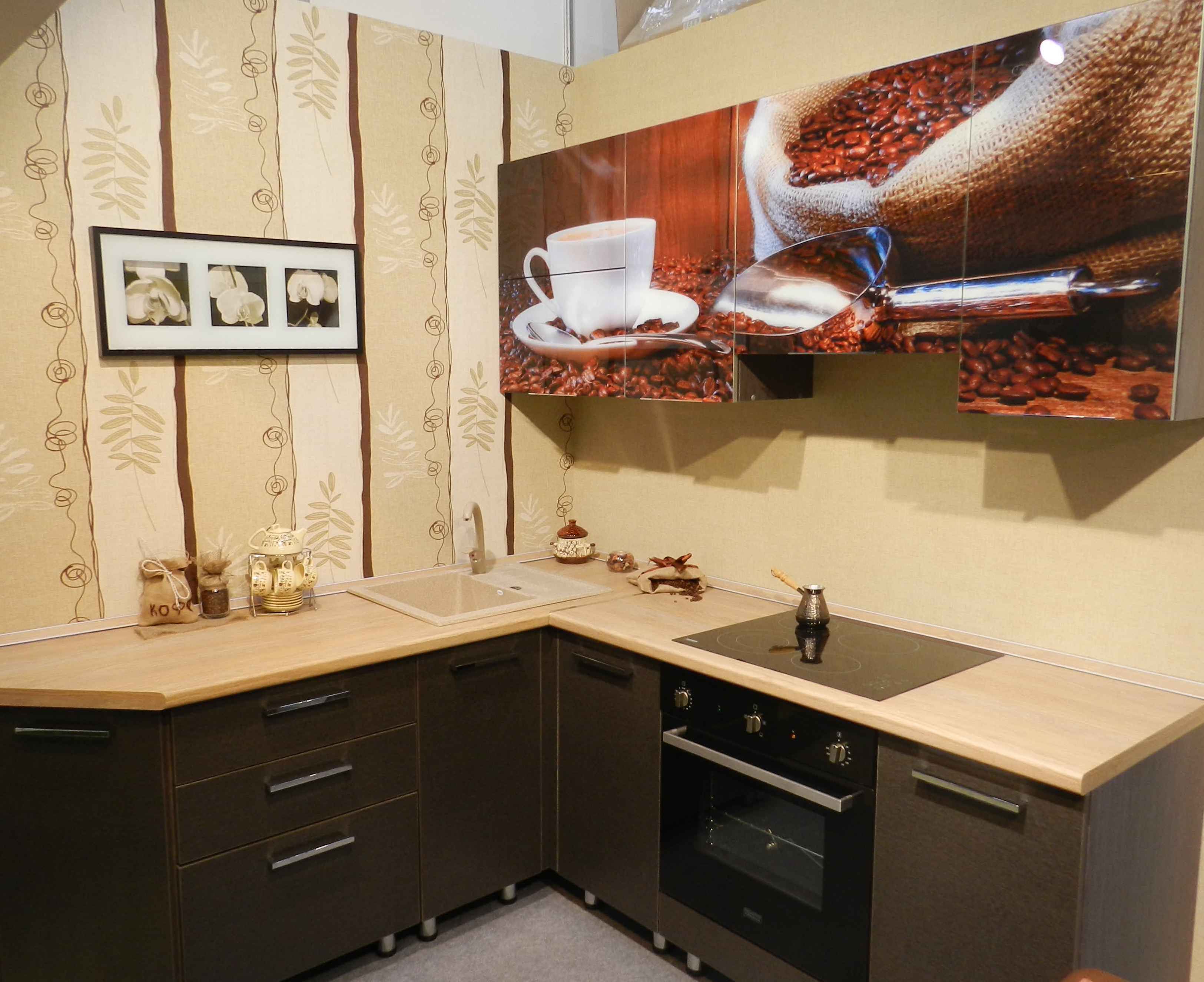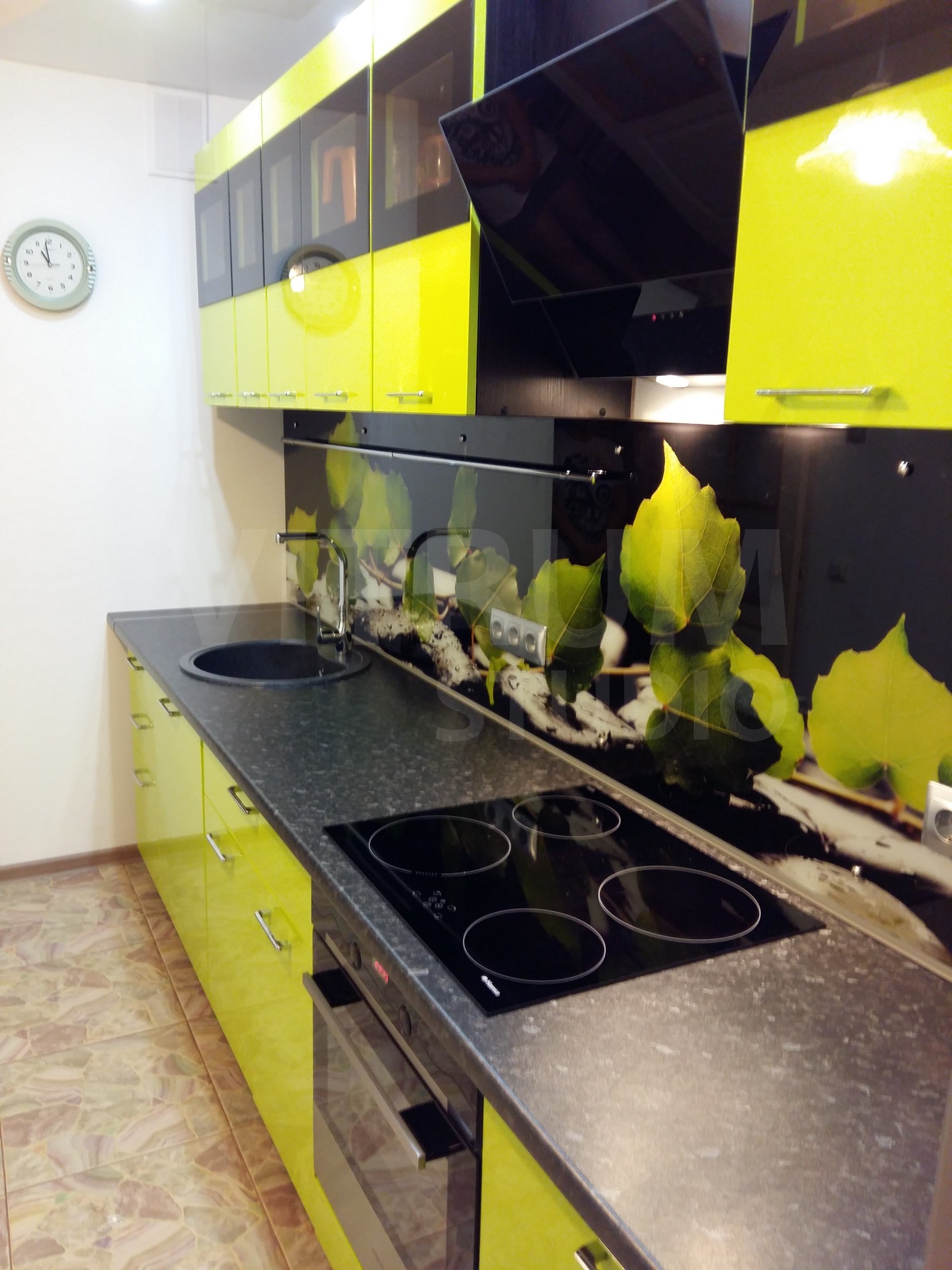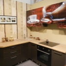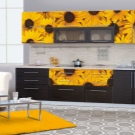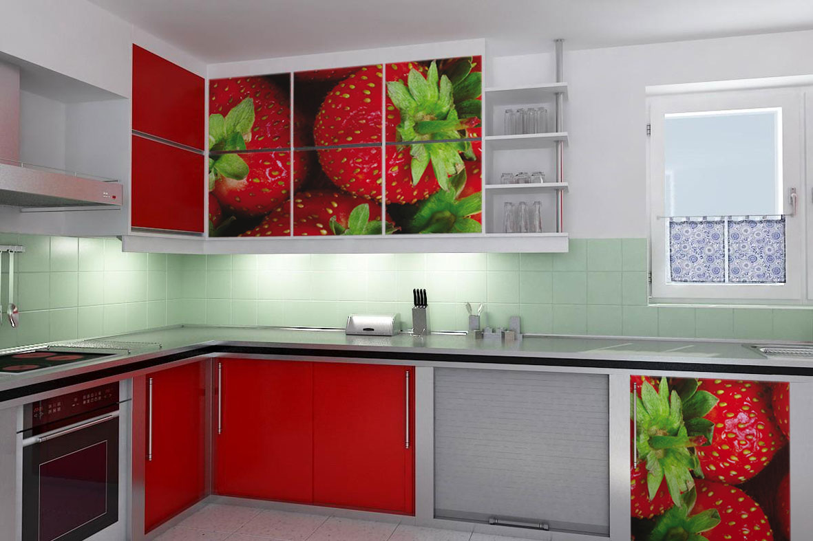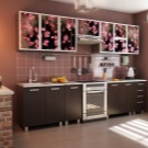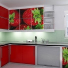 To decorate the facades of the kitchen, you can use photo printing. This unusual design solution, complemented by lighting, will visually create the effect of weightless furniture.