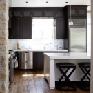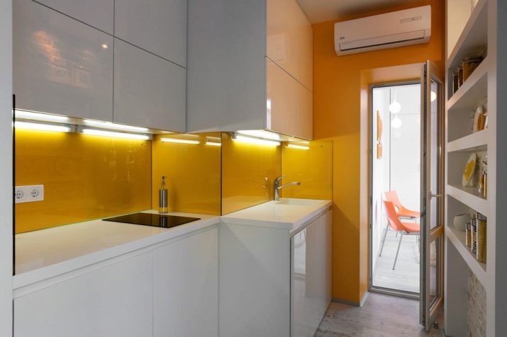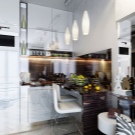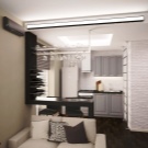If the parameters of your room are rectangular or any other elongated, you should use transverse zoning. The kitchen in this case will be located along the end wall. It can be bright, as a stylish design element, or to merge with the walls, to be with them in the same color range.