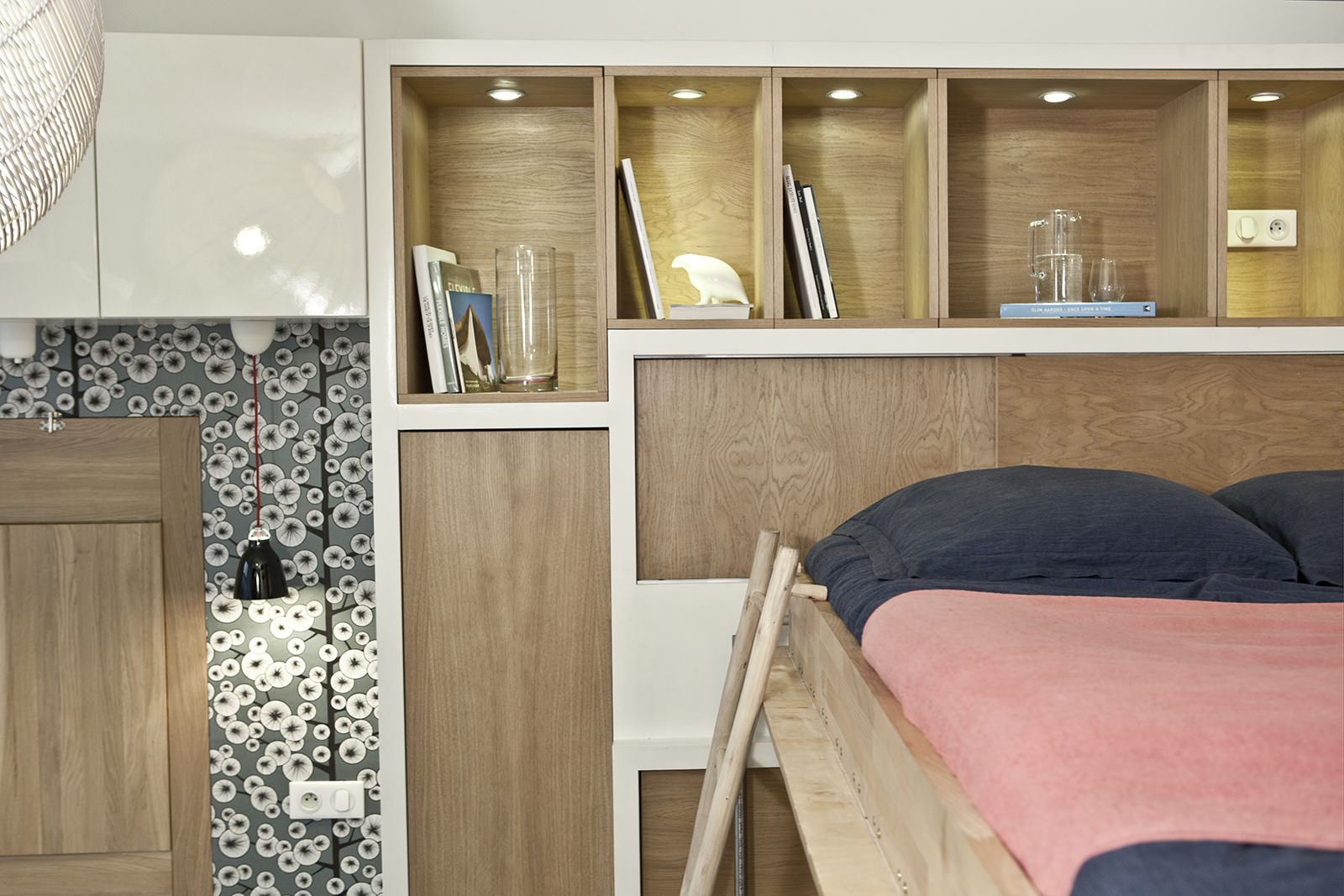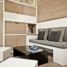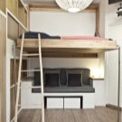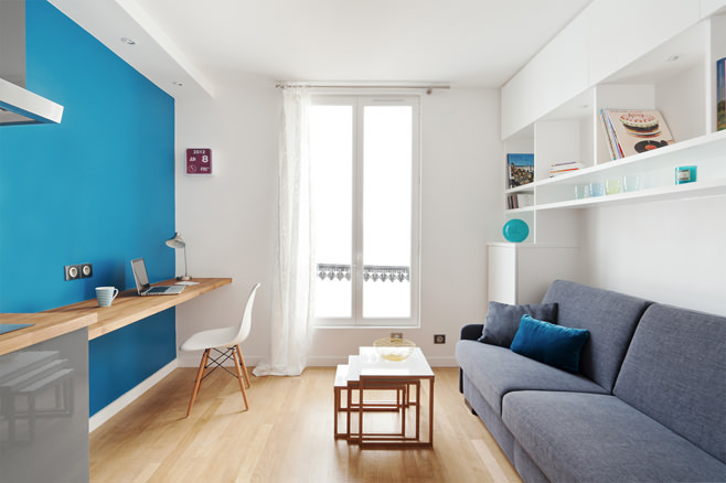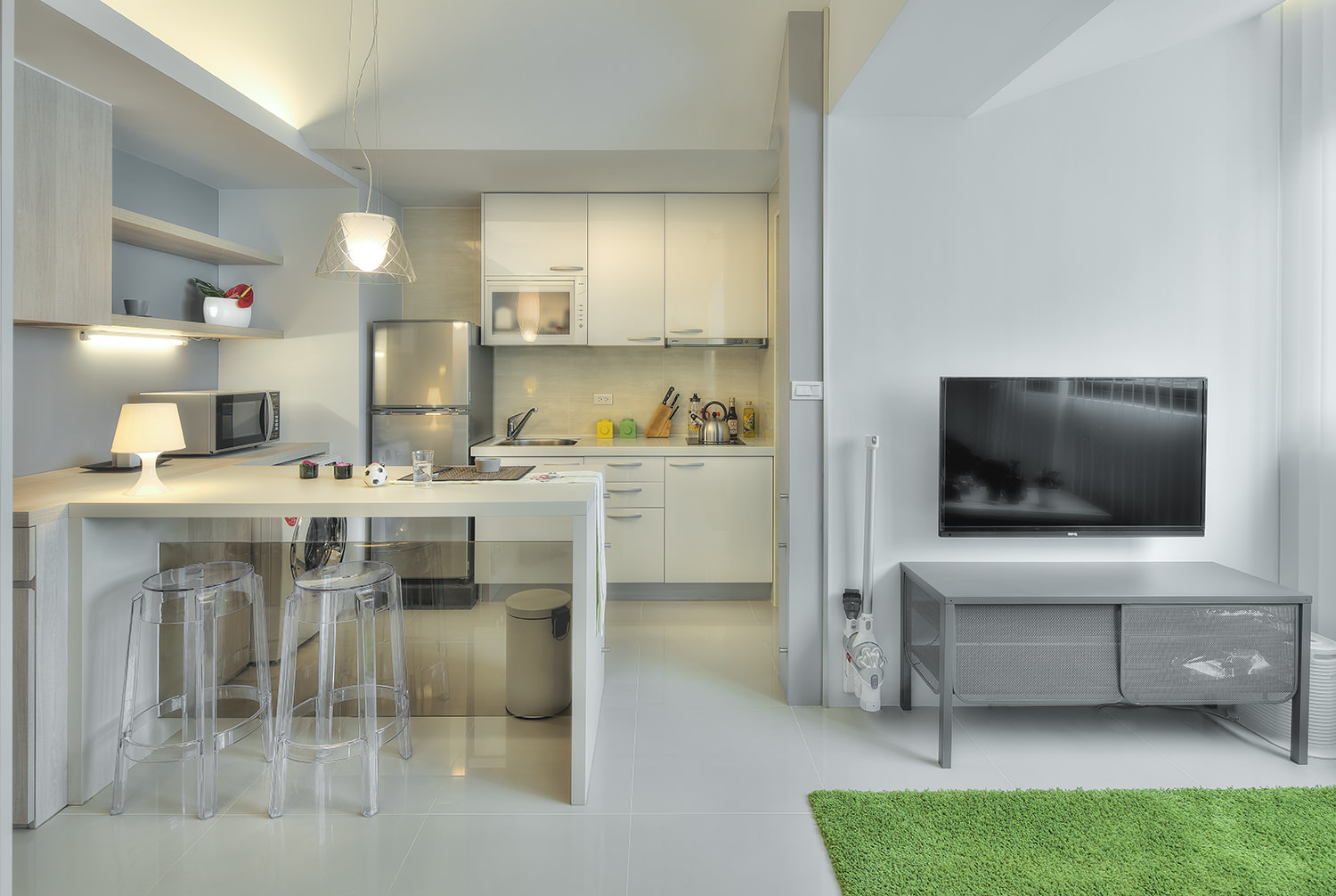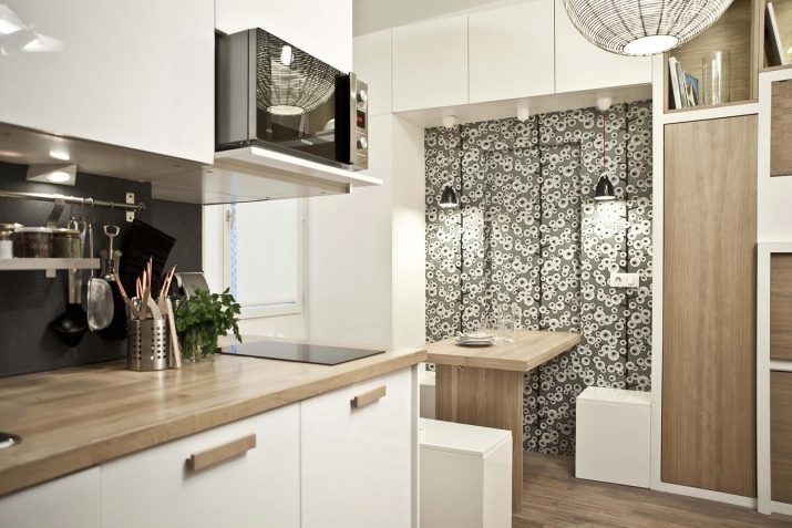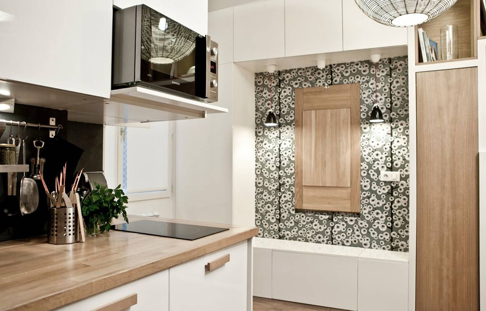 When designing the kitchen area, use built-in appliances, sliding shelves and countertops, if possible, place household appliances on the brackets. The kitchen can be lifted using the podium above the floor, and the vacated space can be used for storage.