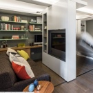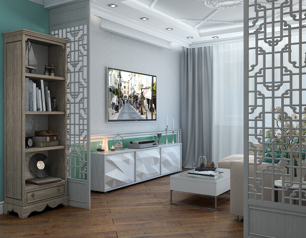 Another option for the partition will be racks with a combination of closed and open parts. This option will also become an additional place to store things, which is so important for small apartments.