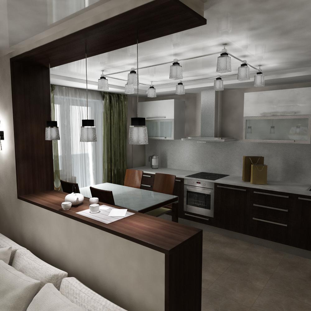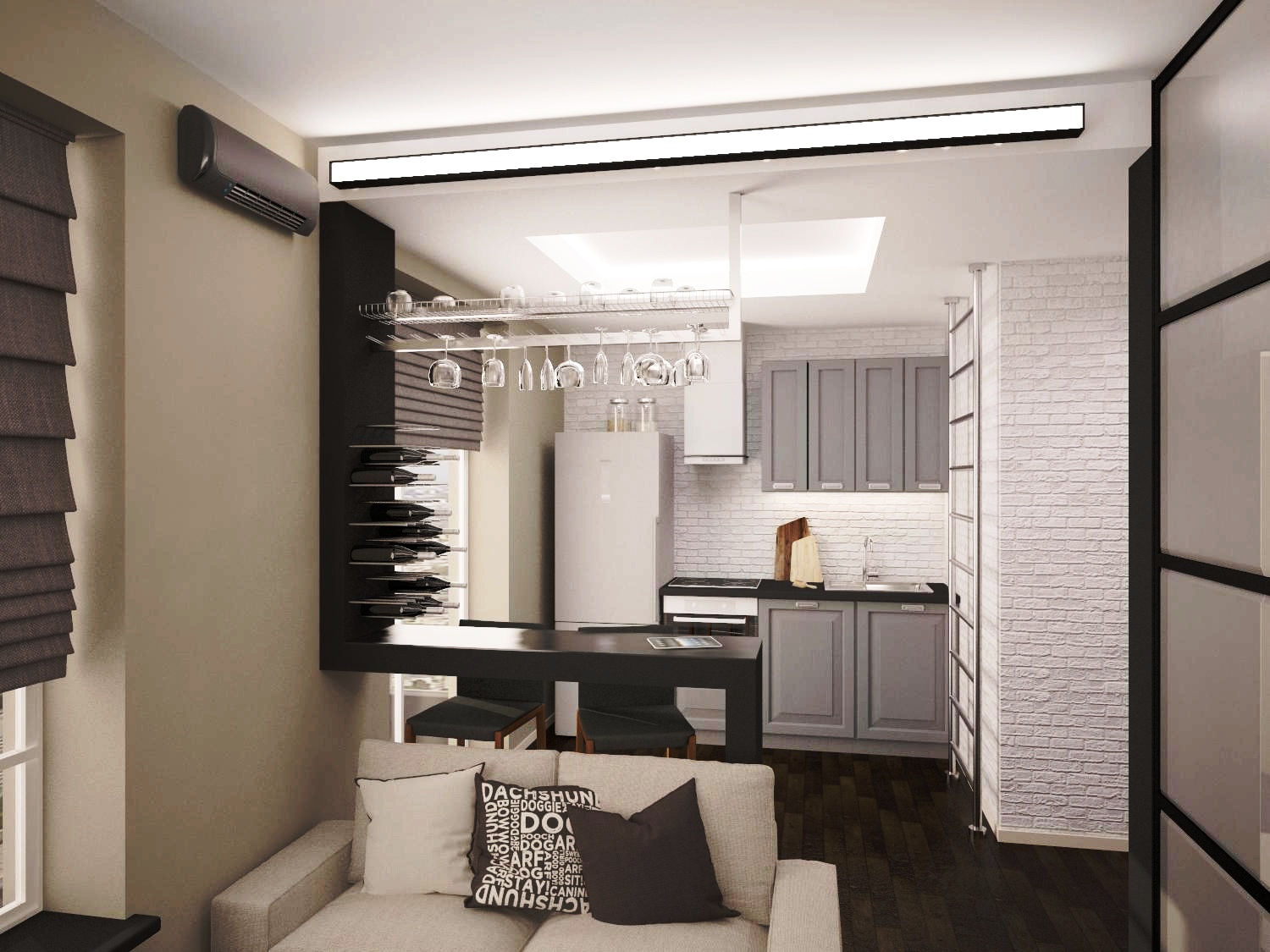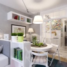 As partitions, well-designed construction of bar racks, which will well delimit the area of the kitchen and living room. In addition, under the high bar-counter, you can easily place the chairs, thereby saving space. As a septum, an ordinary curtain made of light fabric on Lurex is quite suitable.