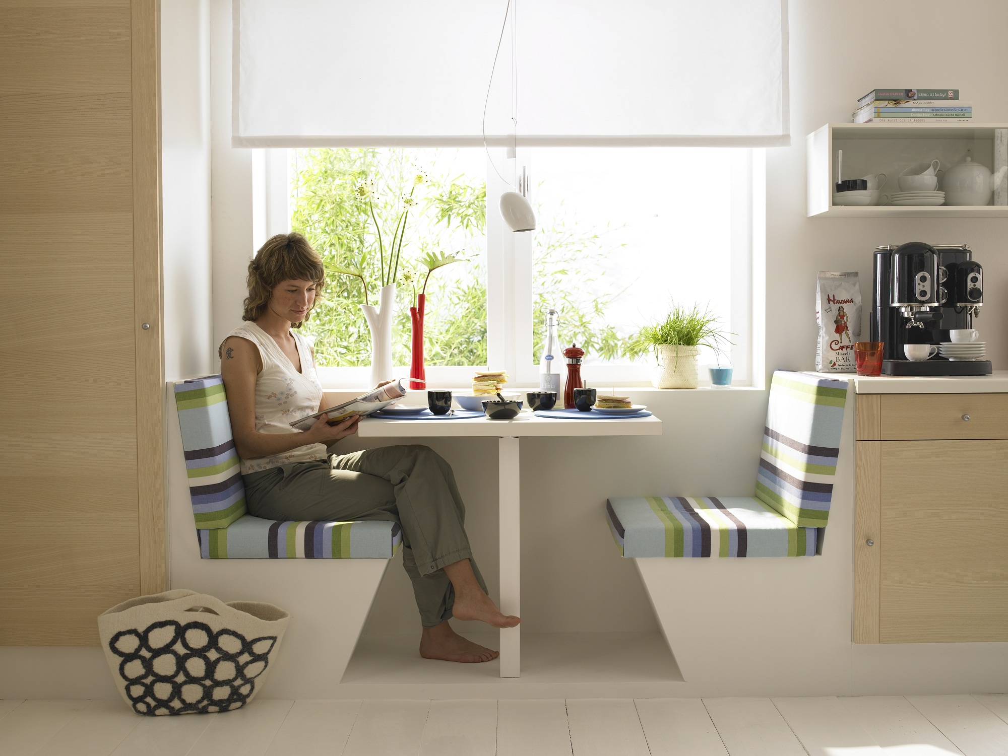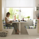 In the event that your studio is an apartment with one window, it is better to position the corner kitchen set along the wall and in a part of the window. The window sill can be used as a tabletop, as a result you will have a decent work surface for cooking, and an open window will add natural light to your home.