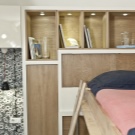 When designing the facades of the cabinet, use mirror and glass elements that will create the illusion of increased space. Shelves on the walls are ideal for storing books, potted flowers, perfumes and figurines. Use the mezzanine for storing seasonal items.