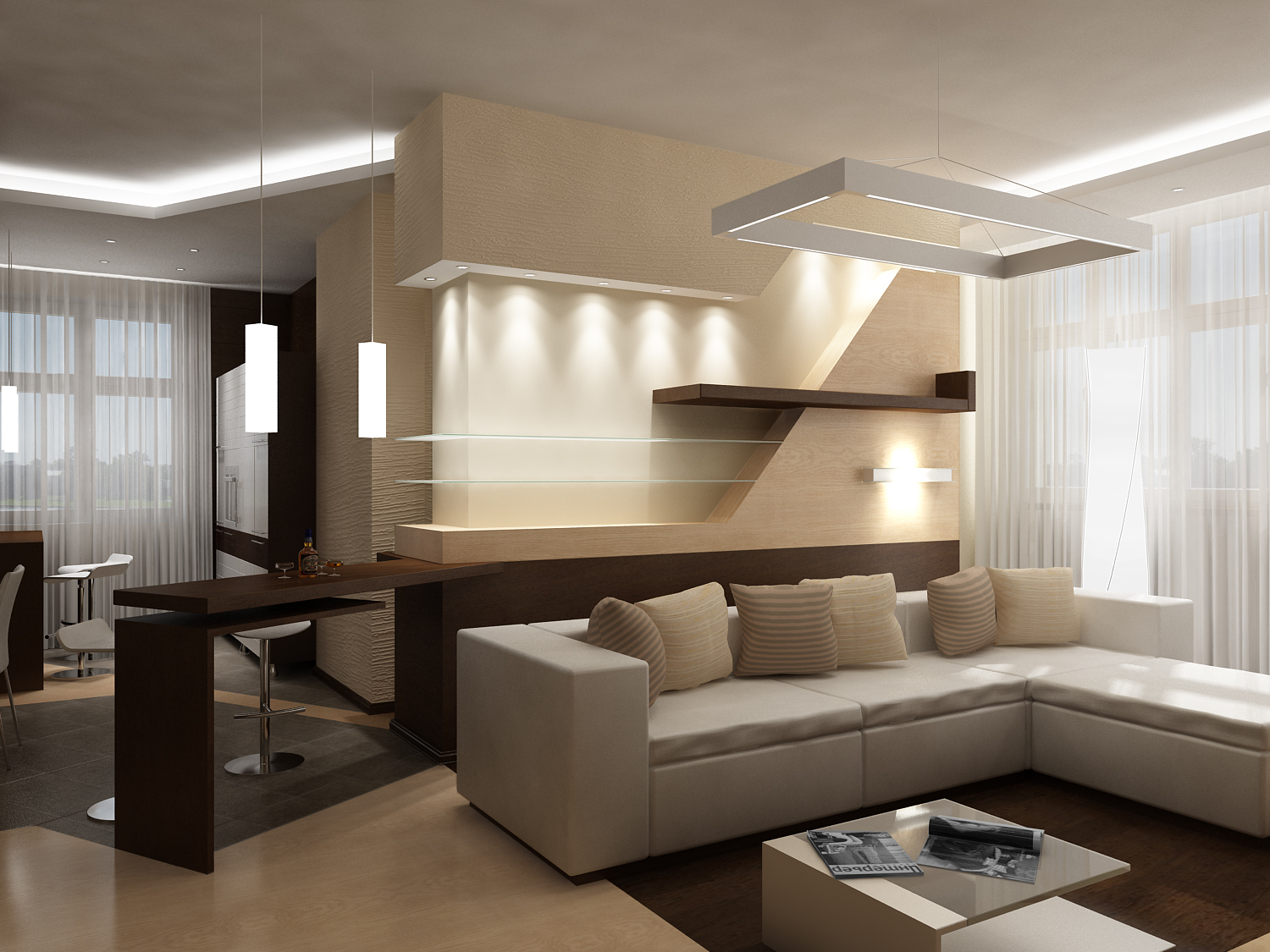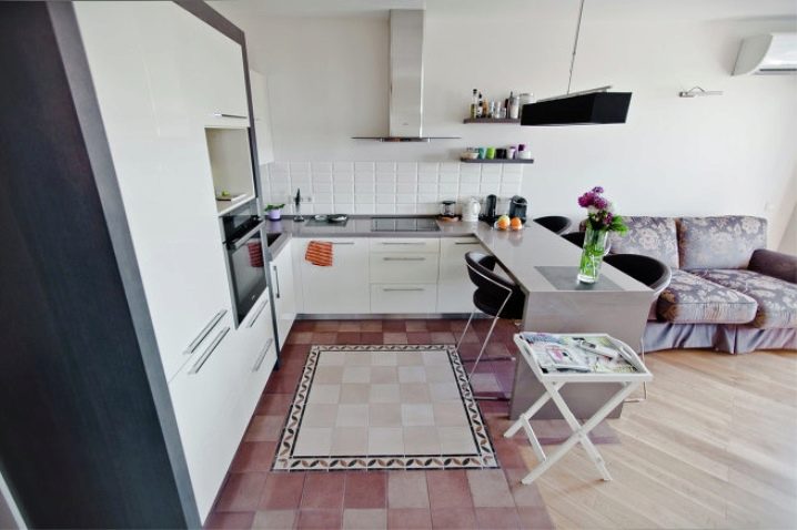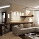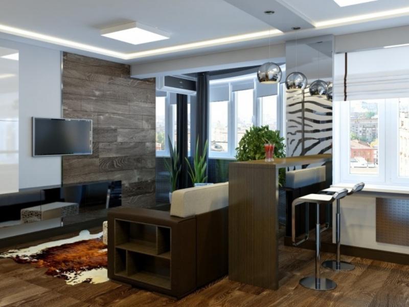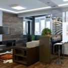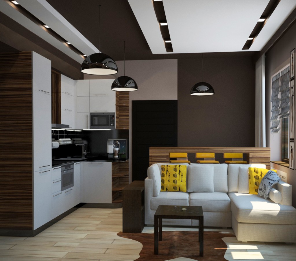 - First, in no case should we neglect the zoning of the room. Be sure to separate the kitchen area from the recreation area with the help of a bar counter, an elevated podium floor or with a differently high ceiling;