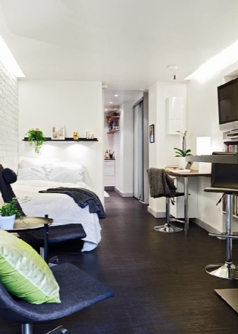 In general, a studio apartment is a living room in which there are no interior partitions, only the bathroom and the hallway are separated. People call these apartments "dormitories", as they resemble a hotel room layout. However, studio apartments can be not only small, but also very spacious in size. Such apartments are considered elite.