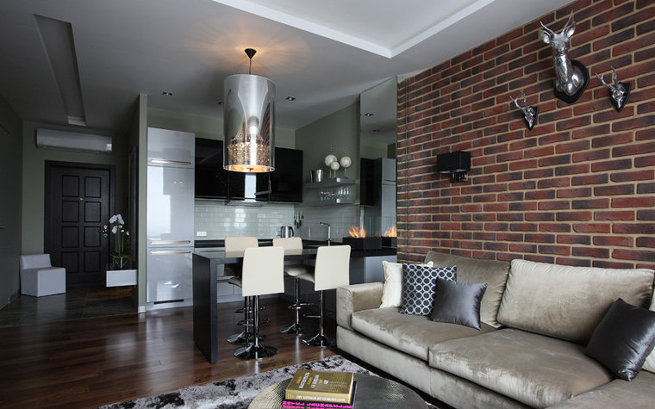 An interesting and unusual style of "loft" will also be very organic in a room with no walls and a small area. Deliberately rough finish of the walls (under the brick), the pipes in sight, will be perfectly combined with chrome technology, mirrors, plain light-colored furniture;