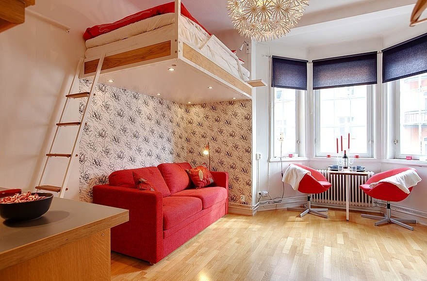 One of the most recommended for small studio apartments is the so-called "Scandinavian" style. It involves the use in the interior of natural materials - wood, stone, metal, glass, leather, etc. This style is very famous and popular due to its cozy simplicity. For decorating the walls are used bright wallpaper, often monochromatic. Furniture in such an interior occupies only about 40% of the usable area, which makes the housing spacious and functional;