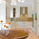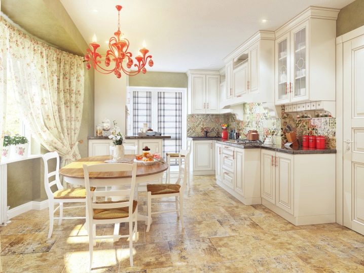 The space of the kitchen and living area can be solved in light beige or peach tones. Natural materials will be a big plus. Wooden table made of light wood, chairs with soft seats on slightly bent legs, cabinets painted on pastoral themes. Kitchen apron can be laid out with a light tile with a grass ornament or an image of wild flowers.