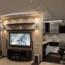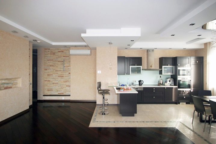 - Different levels of space. The delimitation of the area of the kitchen-studio by levels is a good solution. There are many options for such zoning.