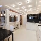 The use of stretch ceilings in the kitchen is fully justified. Dust and pollution spoil the whitewashing and ceiling wallpaper, leaving soot on them. To maintain the stretch ceiling in its pure form, you only need to wipe it with a damp cloth 2-3 times a year.